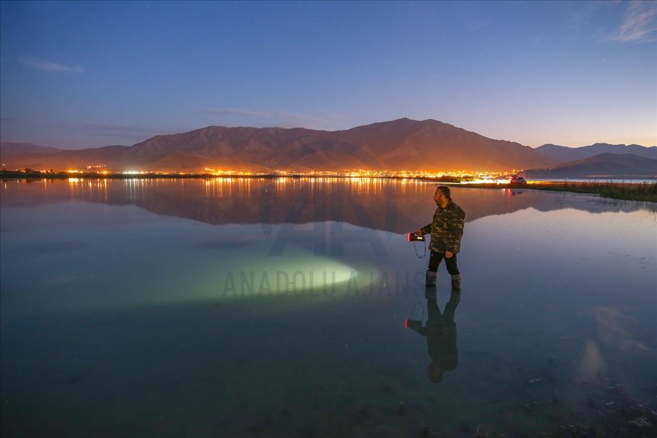 Las aguas costeras y poco profundas reflejan la espectacular naturaleza del lago Van, que proporciona un ambiente tranquilo lejos del ruido de la ciudad en la provincia oriental de Van de Turquía el 4 de octubre, 2020.Özkan Bilgin