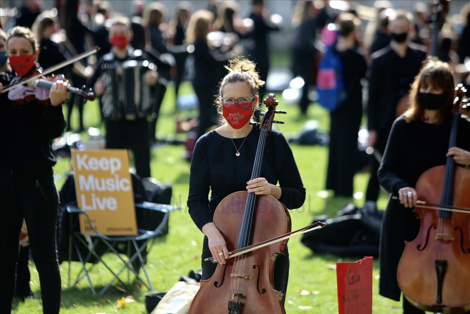 Un grupo de músicos se manifiesta a través de la música frente a la Plaza del Parlamento de Londres contra las recientes restricciones impuestas contra la pandemia del coronavirus COVID-19 en Londres, Reino Unido, el 6 de octubre, 2020.Hasan Esen