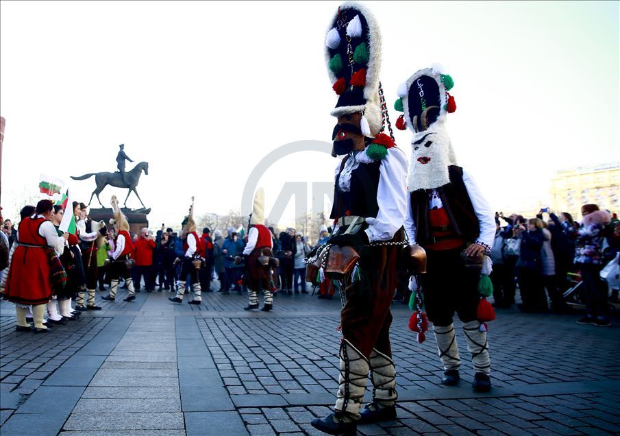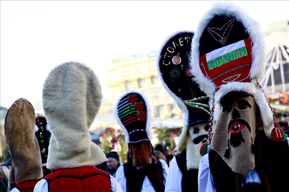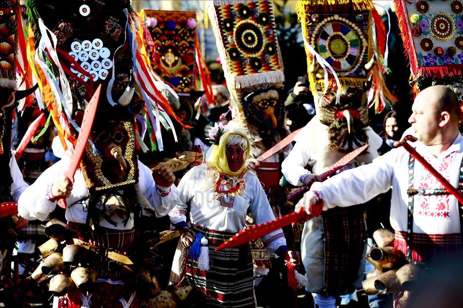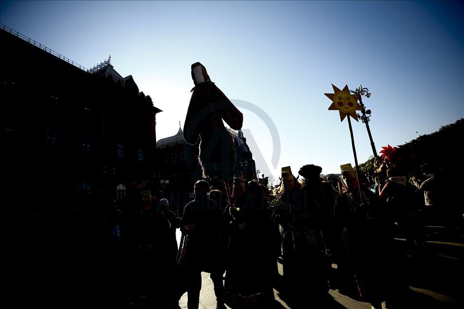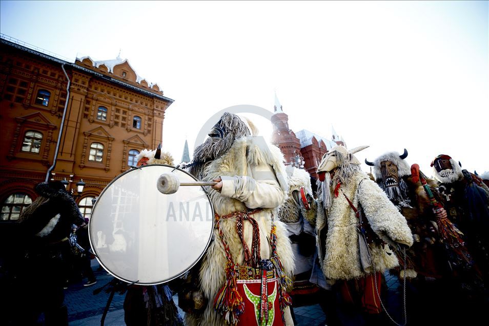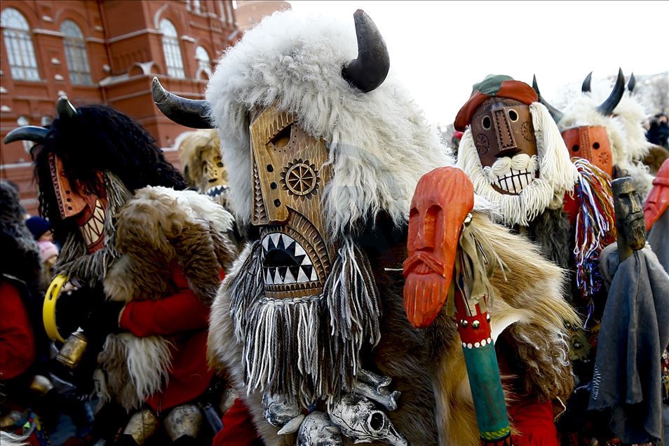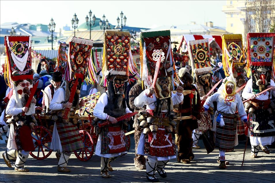 Artistas usan máscaras de miedo para entretener al público durante el festival Maslenitsa [Semana de la crepe] que celebra el final del invierno y marca la llegada de la primavera, en la Plaza Manezhnaya en Moscú, Rusia, el 21 de febrero de 2020.