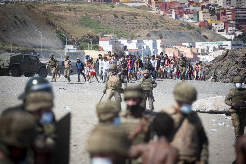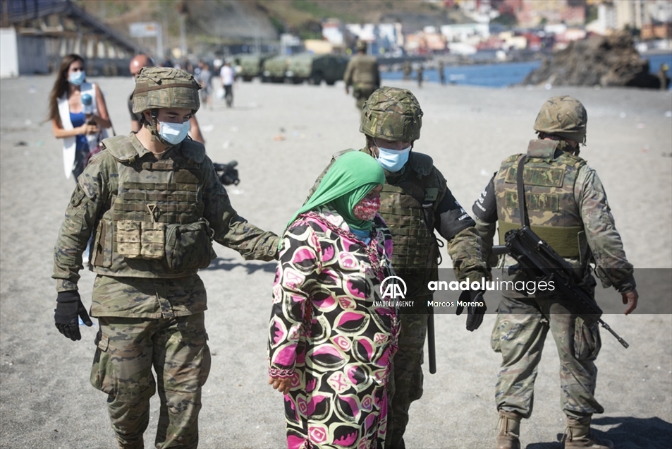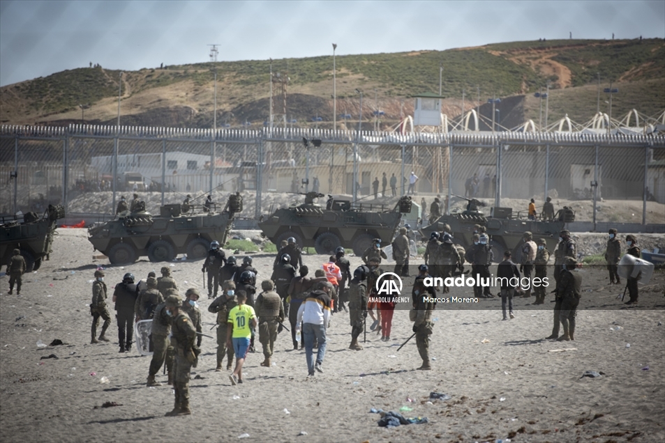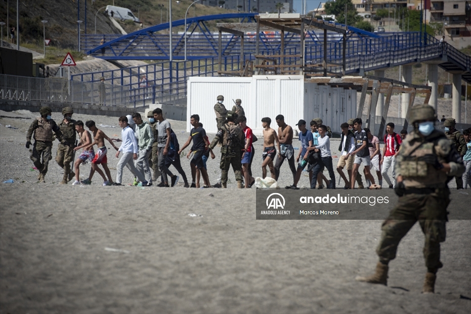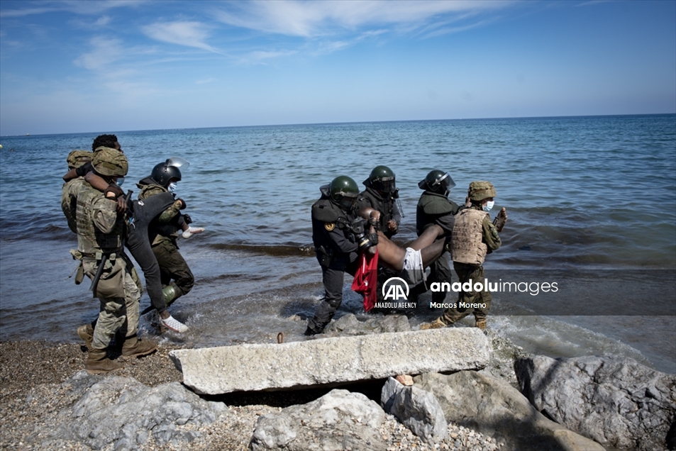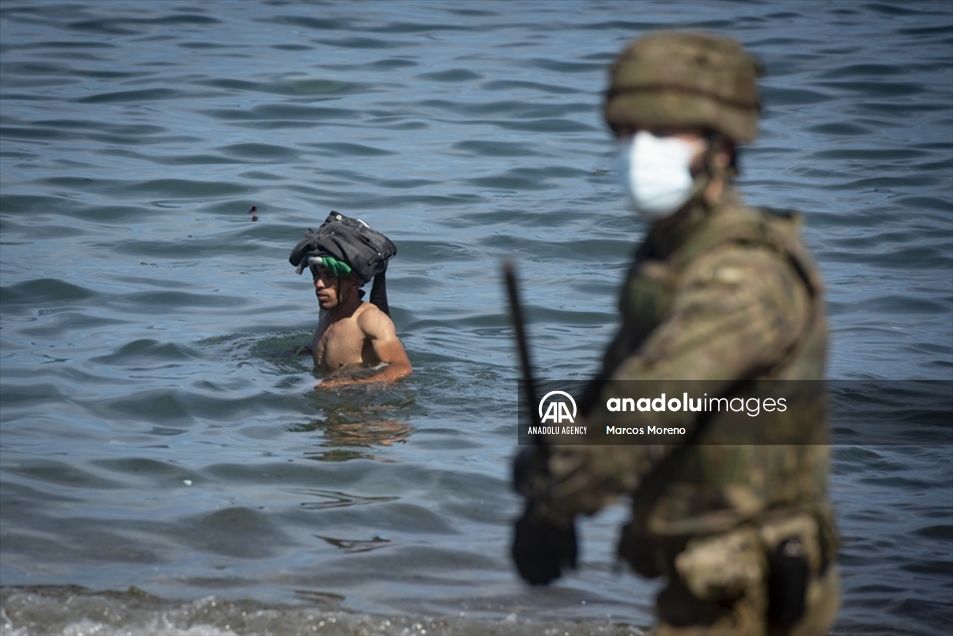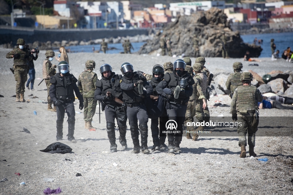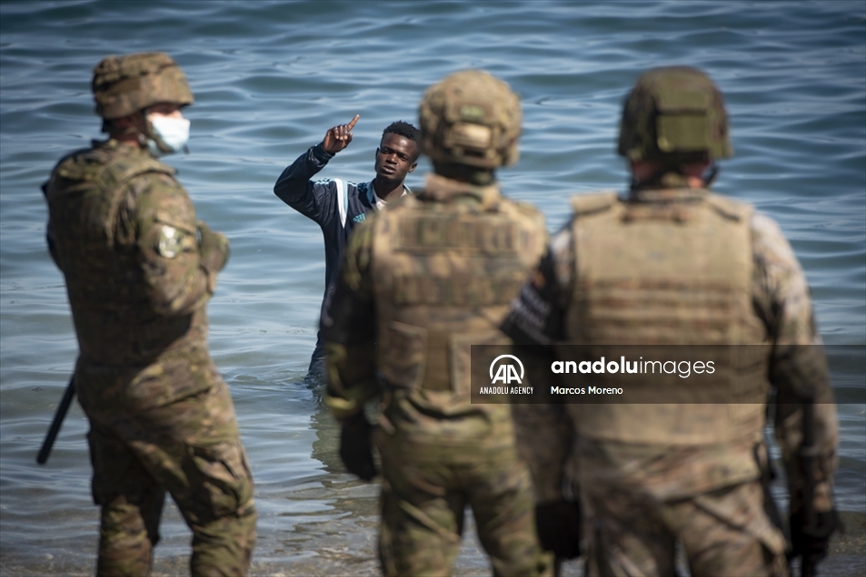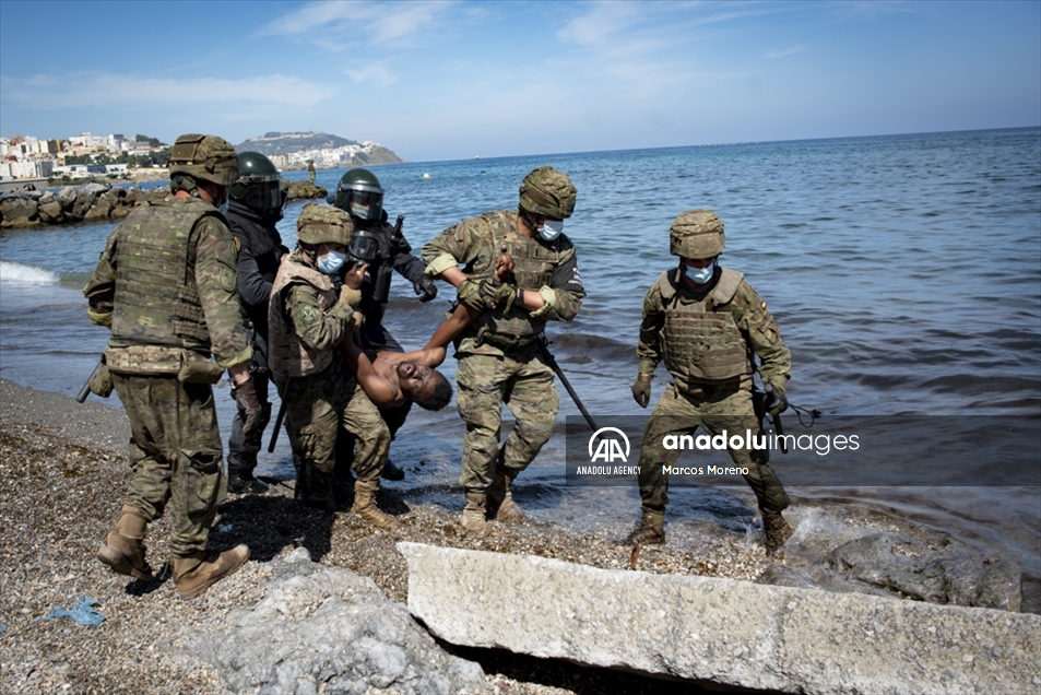 Militares españoles permanecen en guardia y detienen a los migrantes que llegan al territorio español de Ceuta, un flujo sin precedentes de casi seis mil migrantes, incluidos muchos menores, han llegado procedentes de Marruecos.