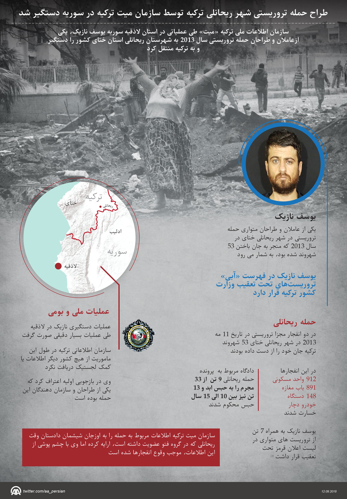 سازمان اطلاعات ملی ترکیه «میت» طی عملیاتی در استان لاذقیه سوریه یوسف نازیک، یکی ازعاملان و طراحان حمله تروریستی سال 2013 به شهرستان ریحانلی استان ختای کشور را دستگیر و به ترکیه منتقل کرد.