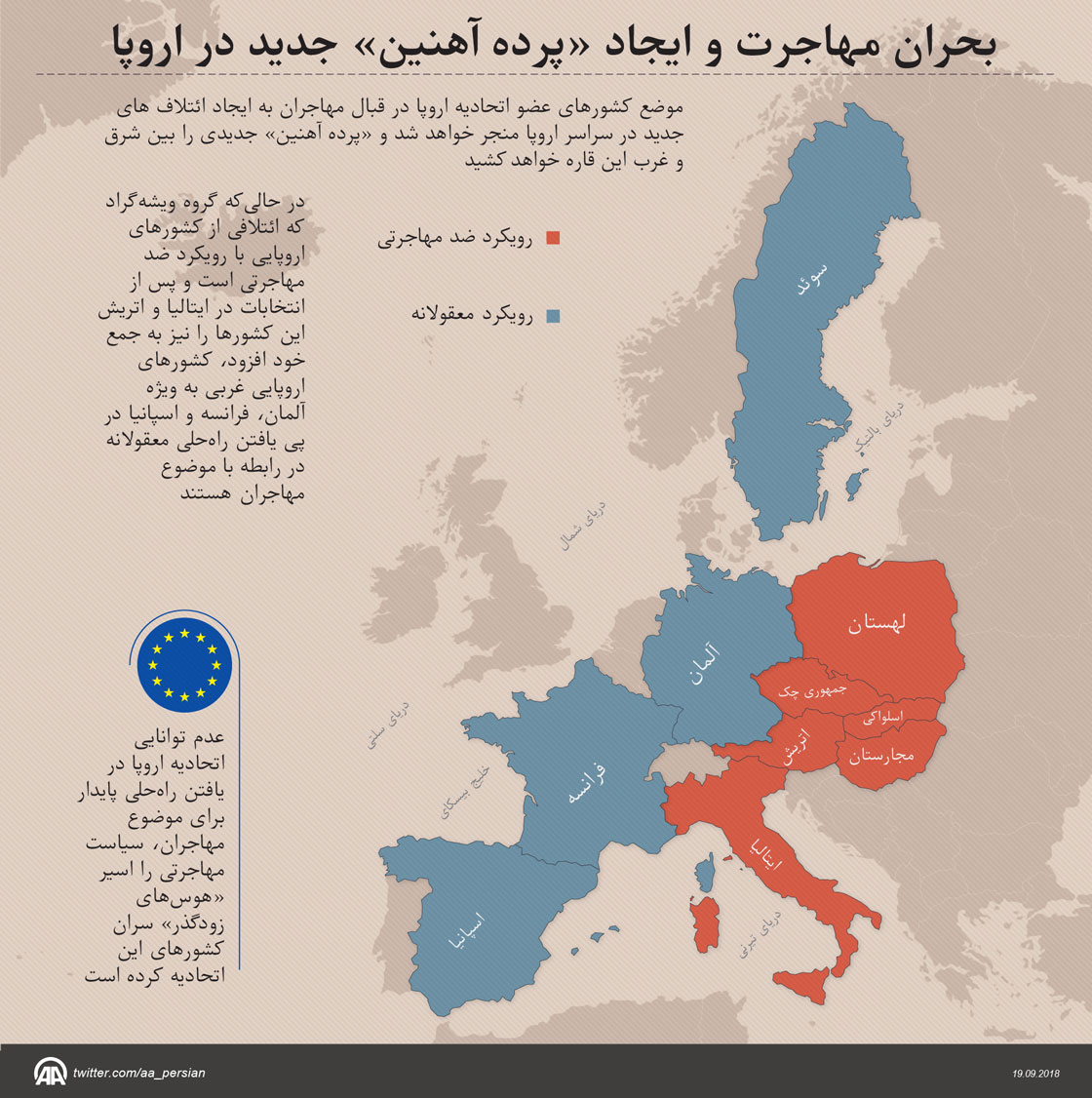در حالیکه گروه ویشهگراد که ائتلافی از کشورهای اروپایی با رویکرد ضد مهاجرتی است و پس از انتخابات در ایتالیا و اتریش این کشورها را نیز به جمع خود افزود، کشورهای اروپایی غربی به ویژه آلمان، فرانسه و اسپانیا در پی یافتن راهحلی معقولانه در رابطه با موضوع مهاجران هستند.