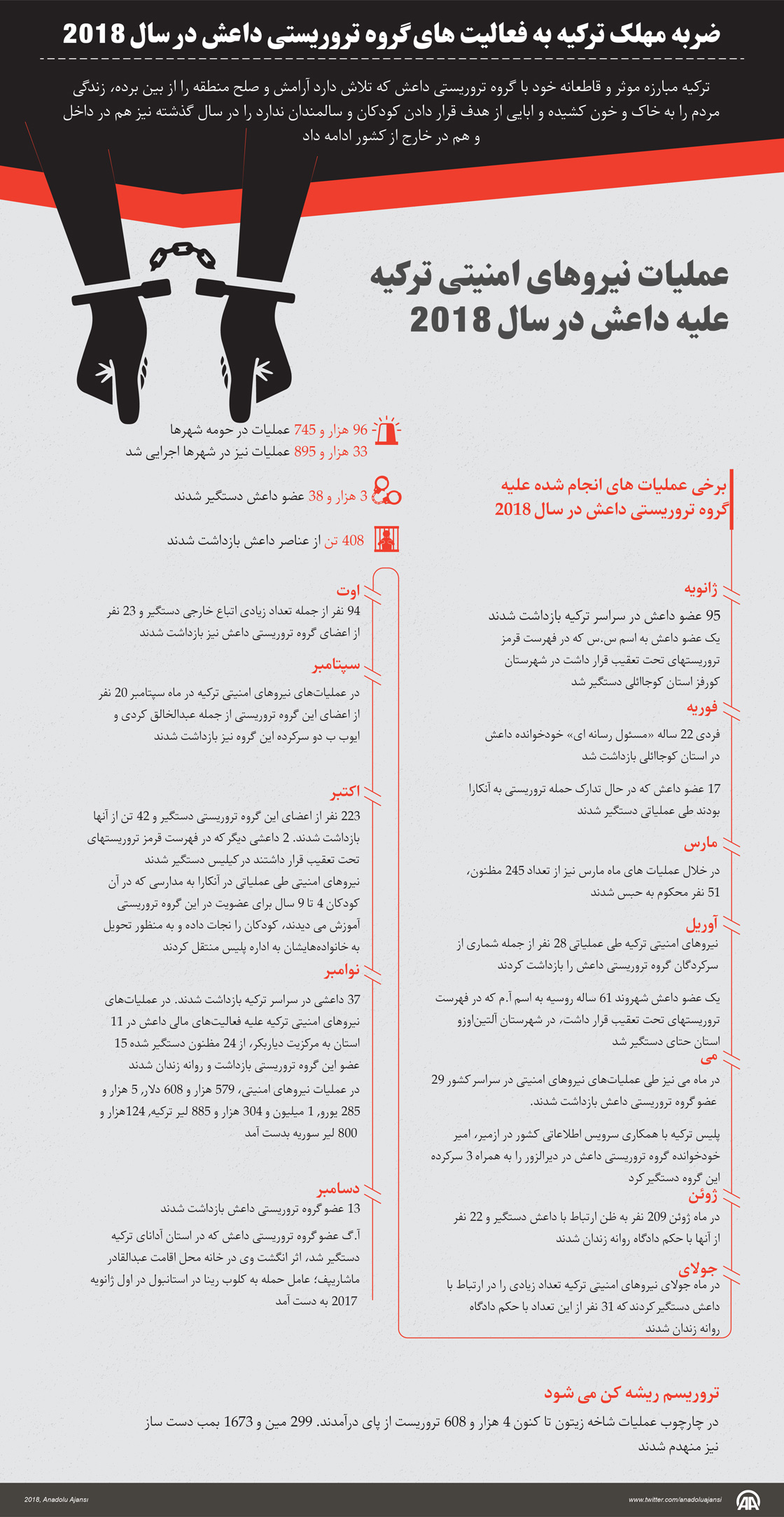 ترکیه مبارزه موثر و قاطعانه خود با گروه تروریستی داعش که تلاش دارد آرامش و صلح منطقه را از بین برده، زندگی مردم را به خاک و خون کشیده و ابایی از هدف قرار دادن کودکان و سالمندان ندارد را در سال گذشته نیز هم در داخل و هم در خارج از کشور ادامه داد02 ژانویه 2019•بهروزرسانی: 02 ژانویه 2019