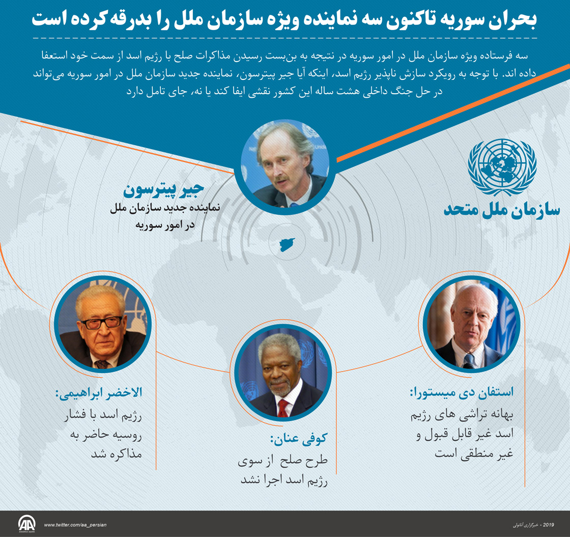 سه فرستاده ویژه سازمان ملل در امور سوریه در نتیجه به بنبست رسیدن مذاکرات صلح با رژیم اسد از سمت خود استعفا داده اند. با توجه به رويکرد سازش ناپذير رژیم اسد، اینکه آیا جیر پیترسون، نماینده جدید سازمان ملل در امور سوریه میتواند در حل جنگ داخلی هشت ساله این کشور نقشی ایفا کند یا نه، جای تامل دارد.09 ژانویه 2019•بهروزرسانی: 09 ژانویه 2019