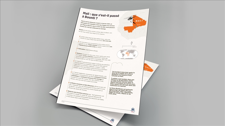 - Dans la nuit de dimanche à lundi, 3-4 janvier 2021, un hélicoptère non-identifié a mené des frappes aux environs du village de Bounti, dans le centre du Mali, tuant plusieurs dizaines de civils qui célébraient un mariage.