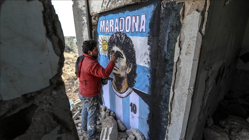 Le graffeur d'Idleb Aziz Esmer a peint une photo du footballeur argentin Diego Armando Maradona, décédé d'une insuffisance cardiaque chronique, sur les murs d'une maison détruite lors d'attaques du régime Assad.