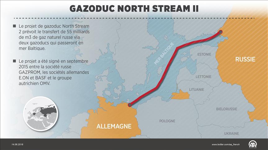 Le projet de gazoduc North Stream 2, qui prévoit le transfert de 55 milliards de m3 de gaz naturel russe via deux gazoducs qui passeront en mer Baltique, a été signé en septembre 2015 entre la Russie et l’Allemagne.