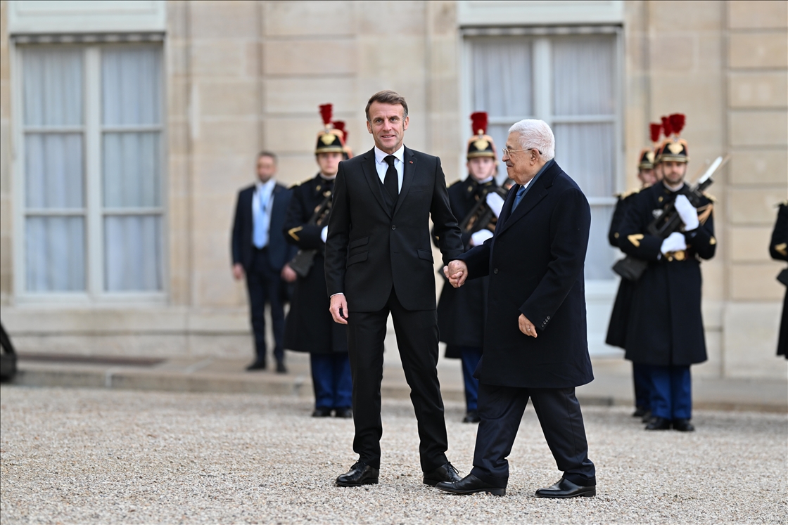 PARIS, FRANCE - 11 NOVEMBRE : Le président français Emmanuel Macron accueille le président palestinien Mahmoud Abbas au palais de l'Élysée à Paris, en France, le 11 novembre 2025. (Mustafa Yalcin - Anadolu Français)Mustafa Yalçın