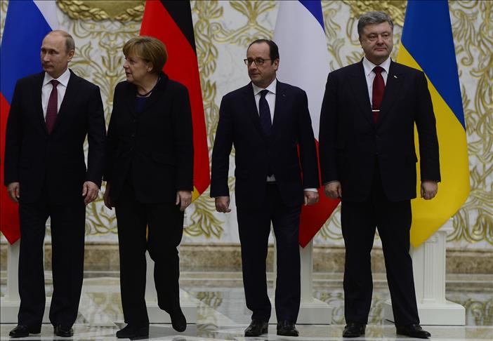 Merkel, Hollande, Poroshenko et Poutine ont tenu leurs premiers pourparlers sur la crise ukrainienne en Normandie, région du nord-ouest de la France, en juin 2014, lors du 70e anniversaire du Débarquement de Normandie.