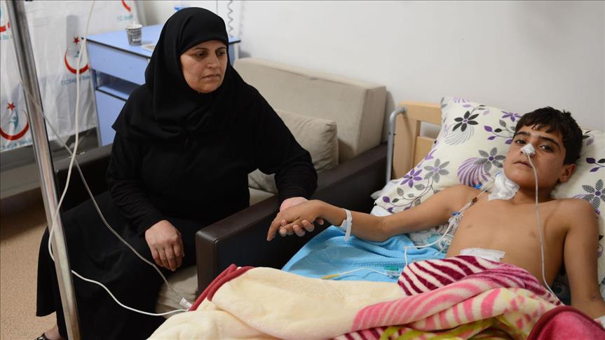 Abdulkafi Auni, 12, yang terluka parah setelah tak sengaja bermain bola menggunakan sebuah bom, berangsur-angsur membaik setelah menerima perawatan di Provinsi Kilis, bagian selatan Turki.