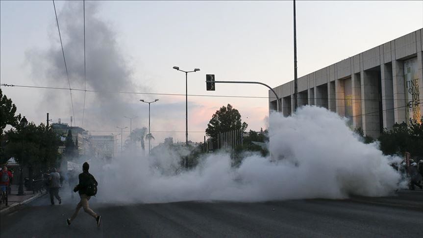 Pengunjuk rasa bentrok dengan polisi di luar Kedutaan Besar Amerika Serikat di Athena, Yunani, pada Rabu.