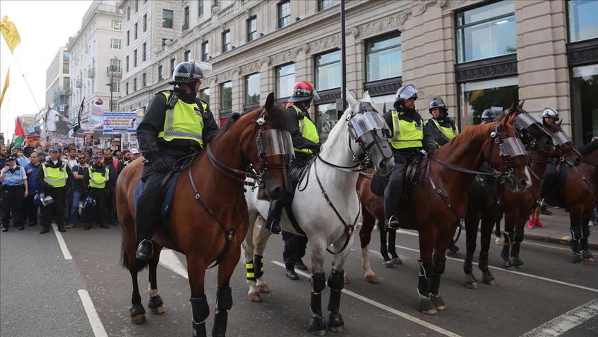Para pengunjuk rasa dan juru kampanye memegang spanduk bertuliskan "Hei, hei, Theresa May, berapa banyak anak-anak yang telah Anda bunuh hari ini?" dan meneriakkan slogan-slogan seperti "Hentikan mempersenjatai Saudi! Hentikan pemboman Yaman!" dan "Keadilan untuk Jamal!".