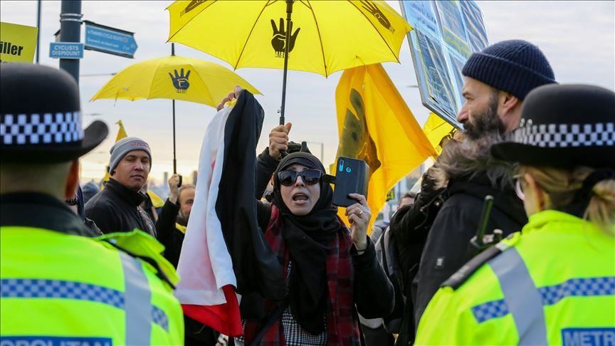 Pengunjuk rasa di London menyuarakan penolakan mereka terhadap Presiden Mesir Abdel Fattah al-Sisi yang menghadiri KTT Investasi Inggris - Afrika atas undangan Perdana Menteri Inggris Boris Johnson.