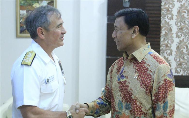 Menteri Koordinator Politik Hukum dan Keamanan (Menkopolhukam) Wiranto bertemu dengan Komandan Komando Militer Amerika Serikat Harry Harris. Ini disampaikan Wiranto saat menerima kunjungan Harris di Kemenkopolhukam, Senin.
