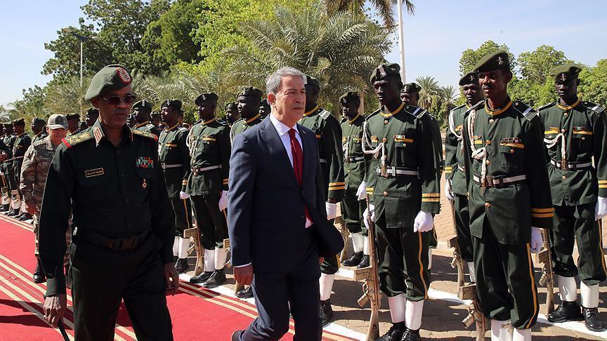 Hulusi Akar disambut oleh Menteri Pertahanan Sudan Ahmed Awad Ibn Auf dengan upacara militer di kota itu.