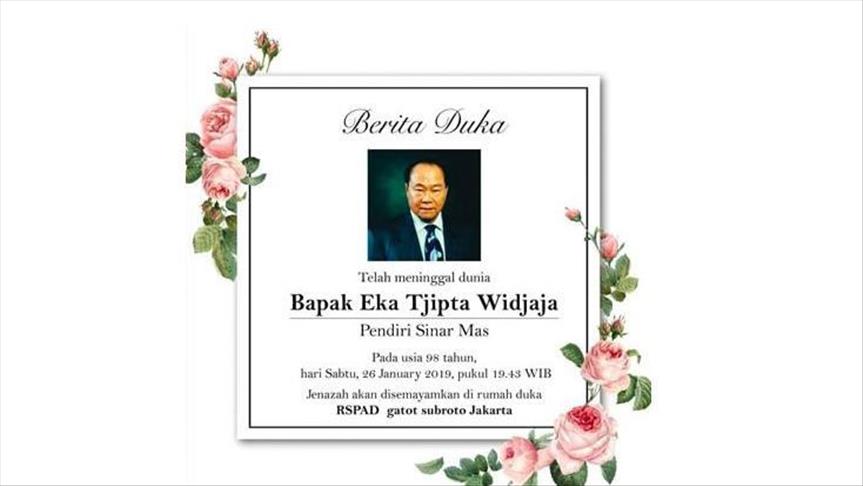 Pengusaha Indonesia pendiri Sinar Mas Group Eka Tjipta Widjaja meninggal dunia di usia 98 tahun, Sabtu malam.