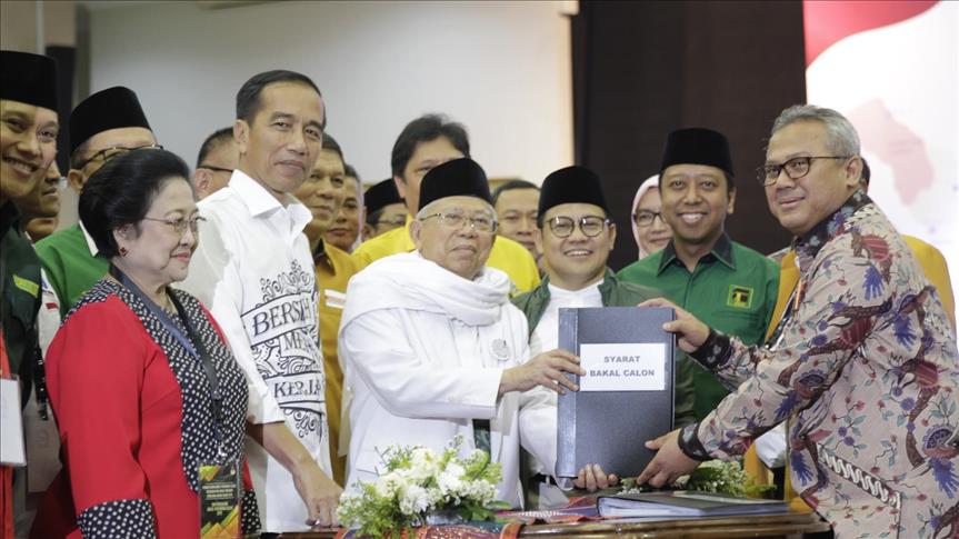 Jokowi -- panggilan Presiden Joko Widodo -- maju dalam bursa pencapresan 2019 ini menggandeng Ketua Majelis Ulama Indonesia sekaligus Rais Aam Pengurus Besar Nadhatul Ulama, Ma'ruf Amin, sebagai calon wakil presiden.