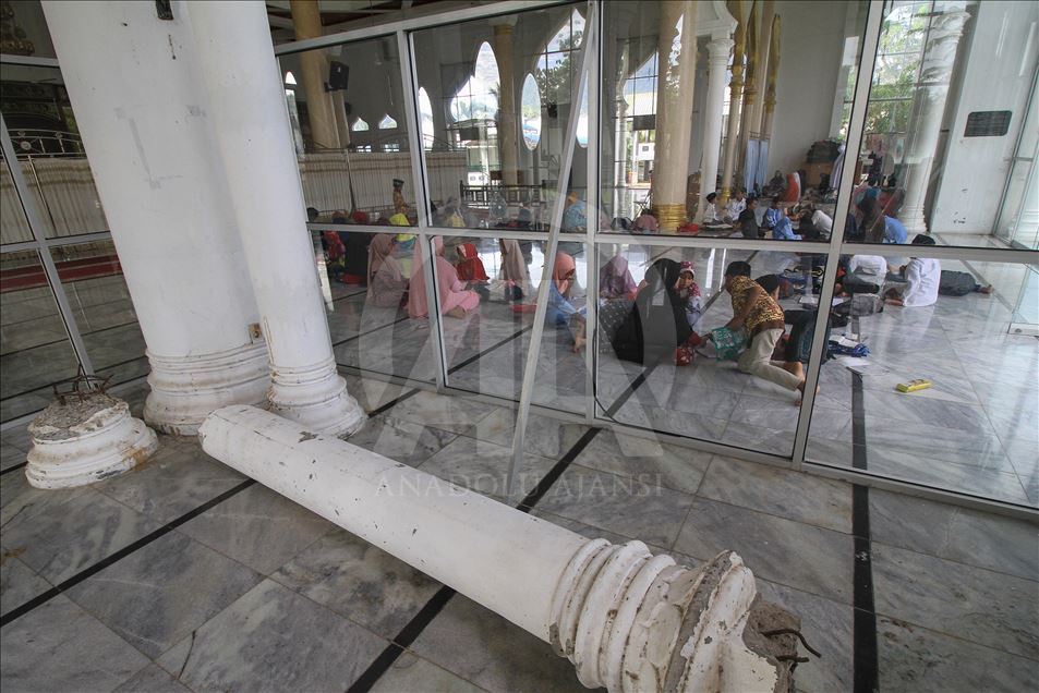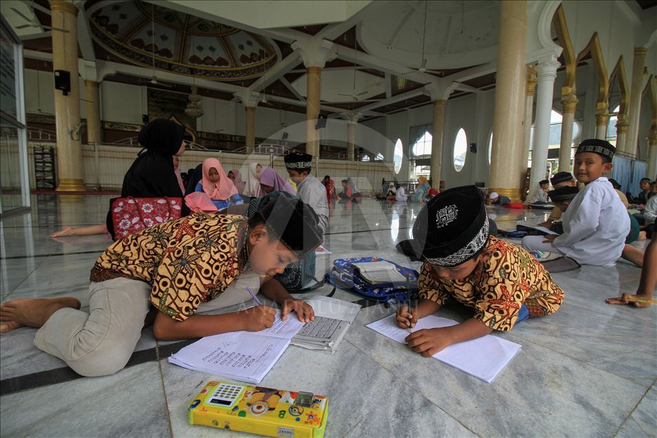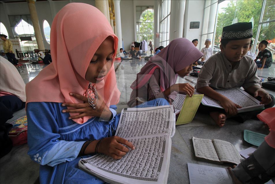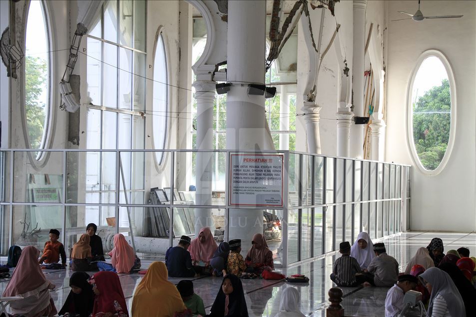 Sejumlah warga mengaji di Masjid Rahmatullah di Lampuuk, kabupaten Aceh Besar, Provinsi Aceh, Indonesia, pada 29 Oktober 2019. Masjid Rahmatullah tetap berdiri kokoh meski seluruh wilayah disekitarnya hancur dihantam gelombang tsunami pada 2004, hanya sebagian sisi masjid yang rusak kemudian Bulan Sabit Merah Turki merenovasinya.