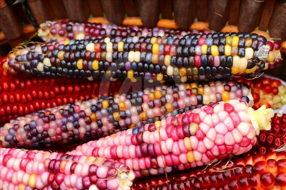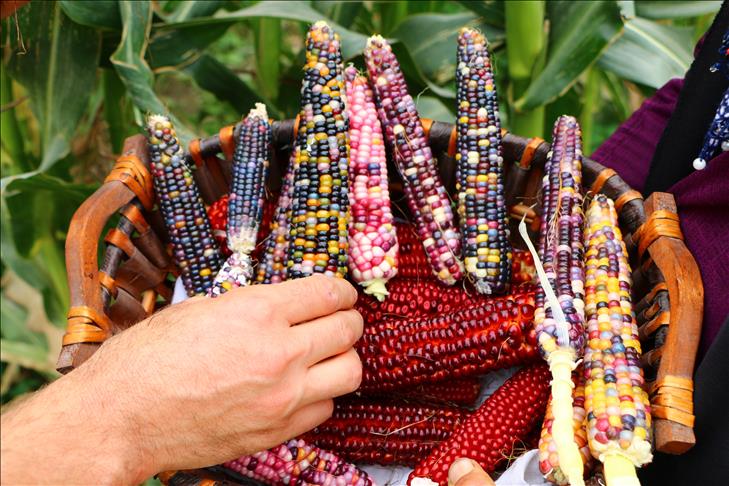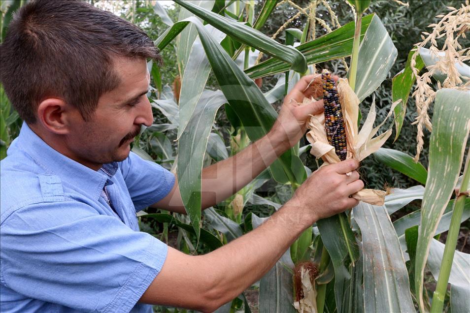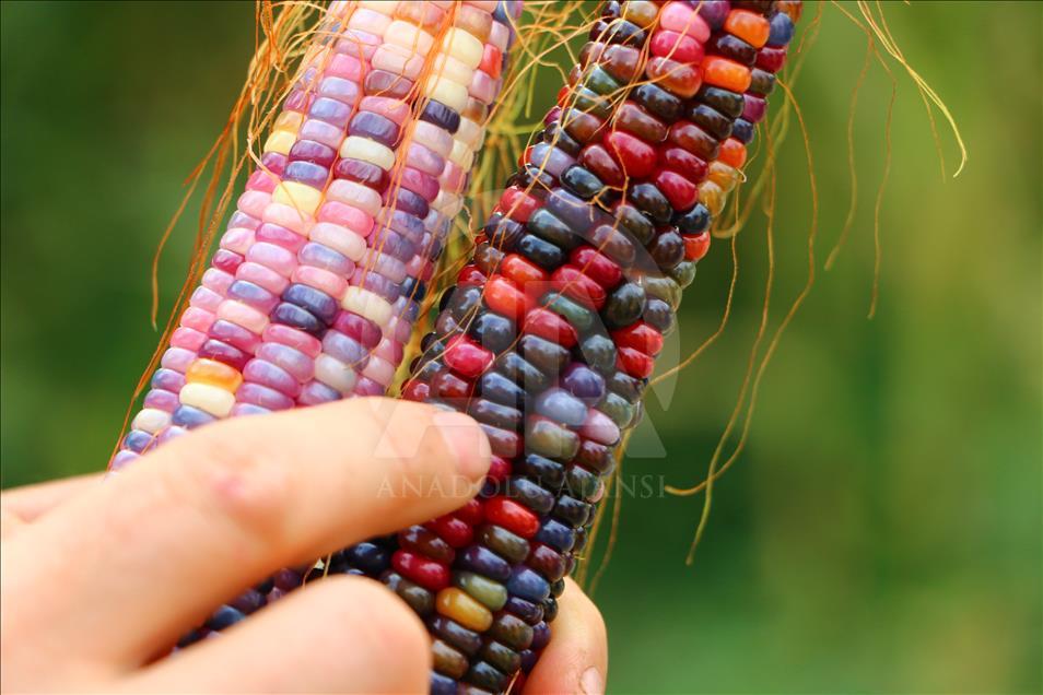 Halis Katman menuai jagung warna-warni pertamanya yang memiliki komposisi warna kuning, biru, merah muda, merah dan oranye. (Adem Koçak-Anadolu Agency)Adem Koçak