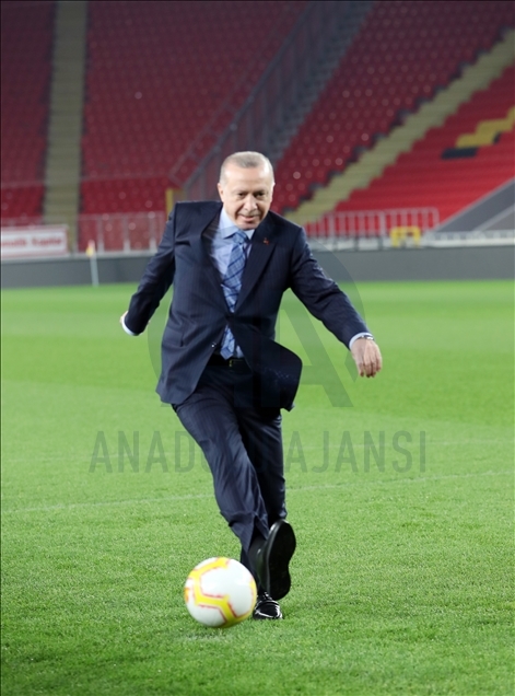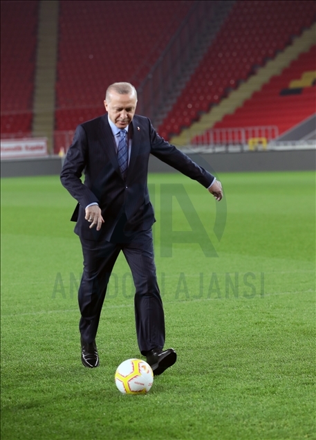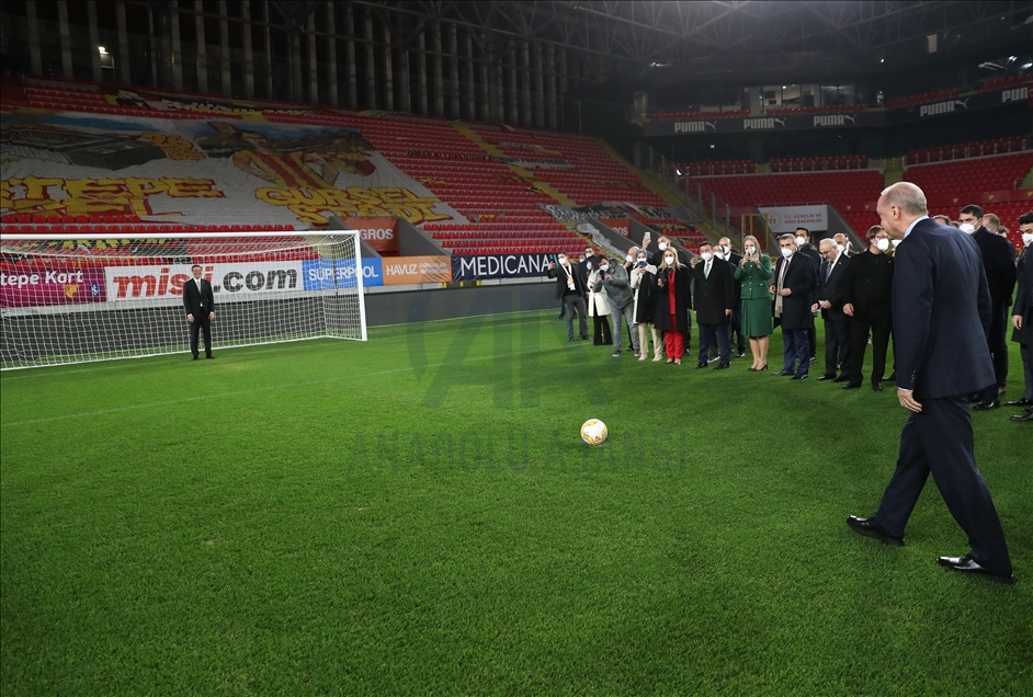 Presiden Turki Recep Tayyip Erdogan melakukan tendangan penalti dalam acara peresmian Stadion Goztepe Gursel Aksel, di provinsi Izmir, Turki pada 22 Februari 2021.TUR Presidency/Murat Cetinmuhurdar