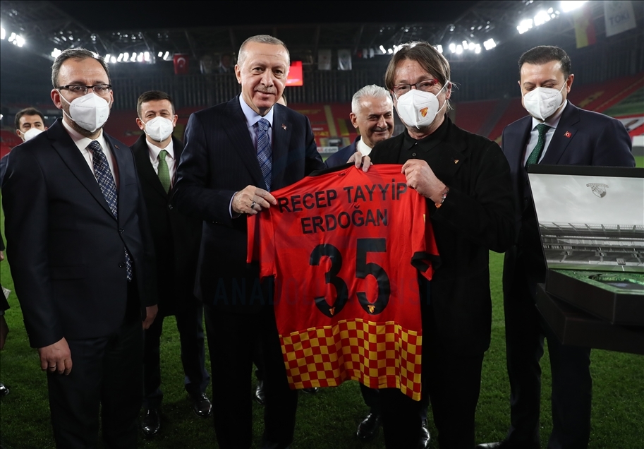 Presiden Turki Recep Tayyip Erdogan (tengah) memeriksa Stadion Goztepe Gursel Aksel, yang dibuka hari ini, di provinsi Aegean Izmir, Turki pada 22 Februari 2021. TUR Presidency/Murat Cetinmuhurdar