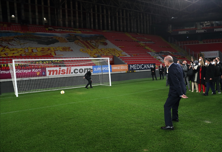 Presiden Turki Recep Tayyip Erdogan melakukan tendangan penalti dalam acara peresmian Stadion Goztepe Gursel Aksel, di provinsi Izmir, Turki pada 22 Februari 2021. (----TUR Presidency/Murat Cetinmuhurdar