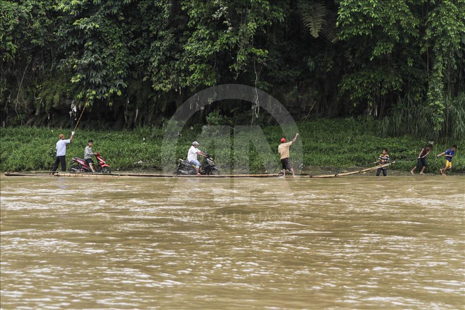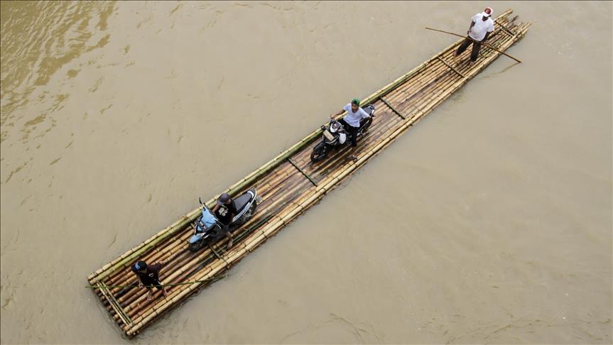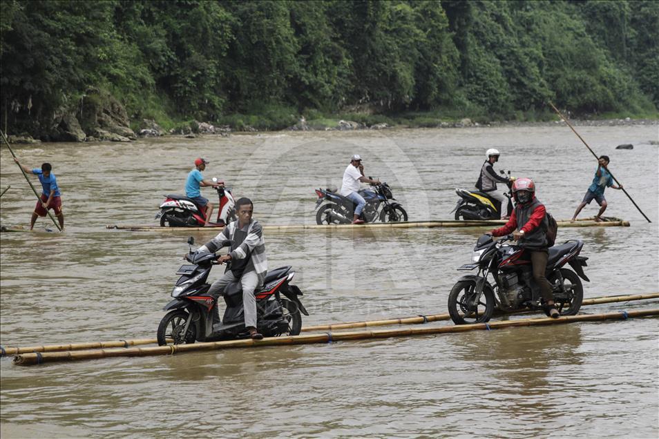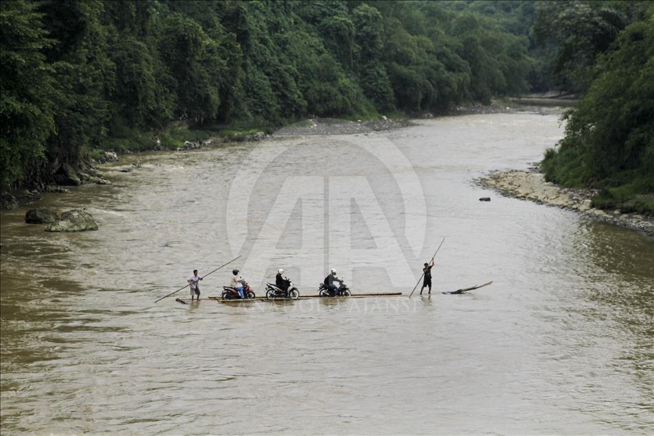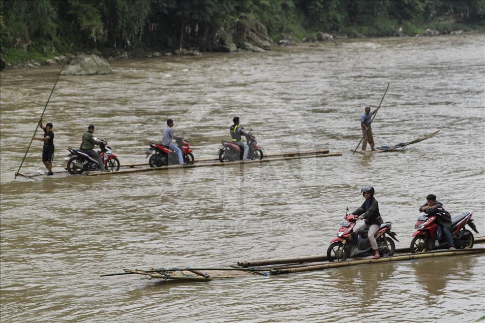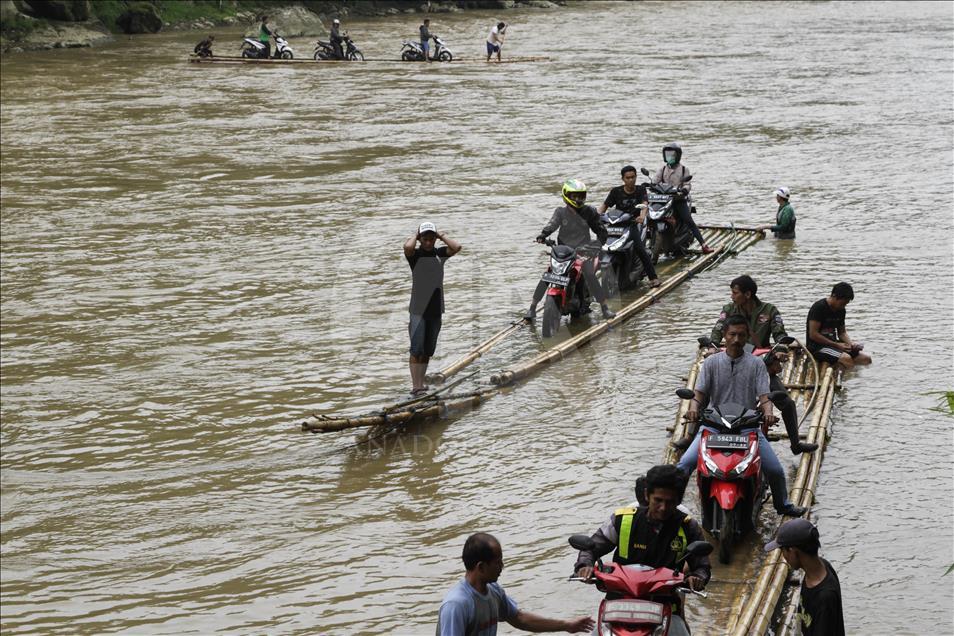 Para pengendara sepeda motor dibantu oleh beberapa orang lainnya menaikkan kendaraan mereka ke atas perahu rakit untuk menyeberangi Sungai Cisadane di Rumpin, Bogor, Jawa Barat, Indonesia pada 13 Maret 2018. Karena jembatan yang menghubungkan jalan utama Rumpin-Ciseeng rusak, warga terpaksa menyeberang sungai dengan memanfaatkan jasa penyeberangan sepeda motor dengan perahu rakit atau getek dan membayar upah Rp10.000 sekali melintas. Eko Siswono Toyudho