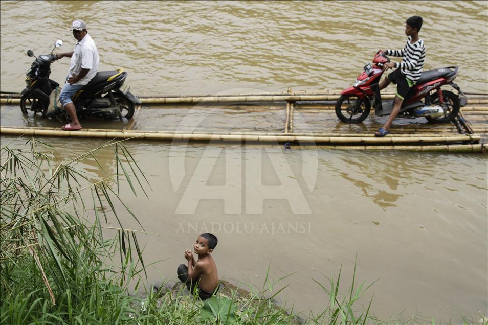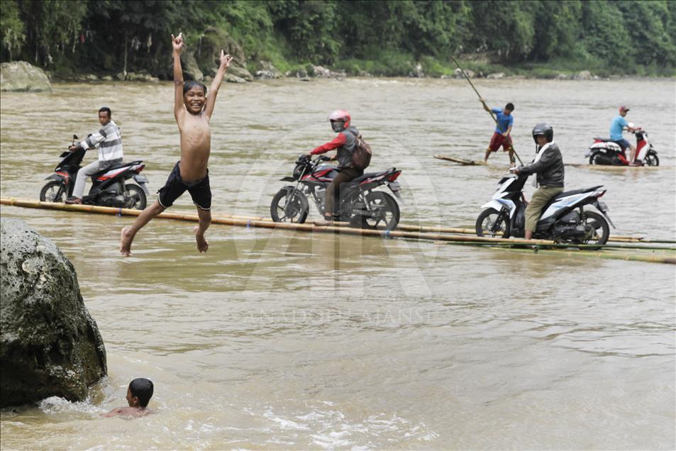 Seorang anak melompat dan berenang sementara para pengendara sepeda motor dibantu oleh beberapa orang lainnya menaikkan kendaraan mereka ke atas perahu rakit untuk menyeberangi Sungai Cisadane di Rumpin, Bogor, Jawa Barat, Indonesia pada 13 Maret 2018. Karena jembatan yang menghubungkan jalan utama Rumpin-Ciseeng rusak, warga terpaksa menyeberang sungai dengan memanfaatkan jasa penyeberangan sepeda motor dengan perahu rakit atau getek dan membayar upah Rp10.000 sekali melintas. Eko Siswono Toyudho
