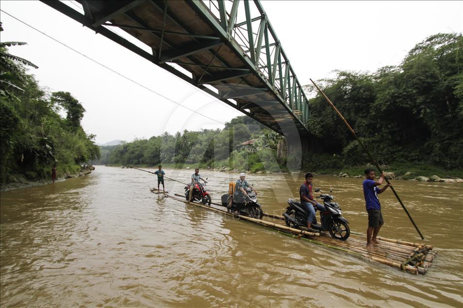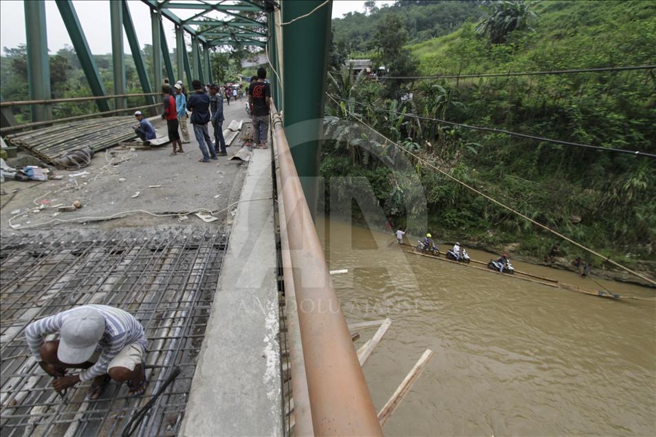 Pekerja memperbaiki jembatan yang rusak sementara para pengendara sepeda motor dibantu oleh beberapa orang lainnya menaikkan kendaraan mereka ke atas perahu rakit untuk menyeberangi Sungai Cisadane di Rumpin, Bogor, Jawa Barat, Indonesia pada 13 Maret 2018. Karena jembatan yang menghubungkan jalan utama Rumpin-Ciseeng rusak, warga terpaksa menyeberang sungai dengan memanfaatkan jasa penyeberangan sepeda motor dengan perahu rakit atau getek dan membayar upah Rp10.000 sekali melintas. Eko Siswono Toyudho