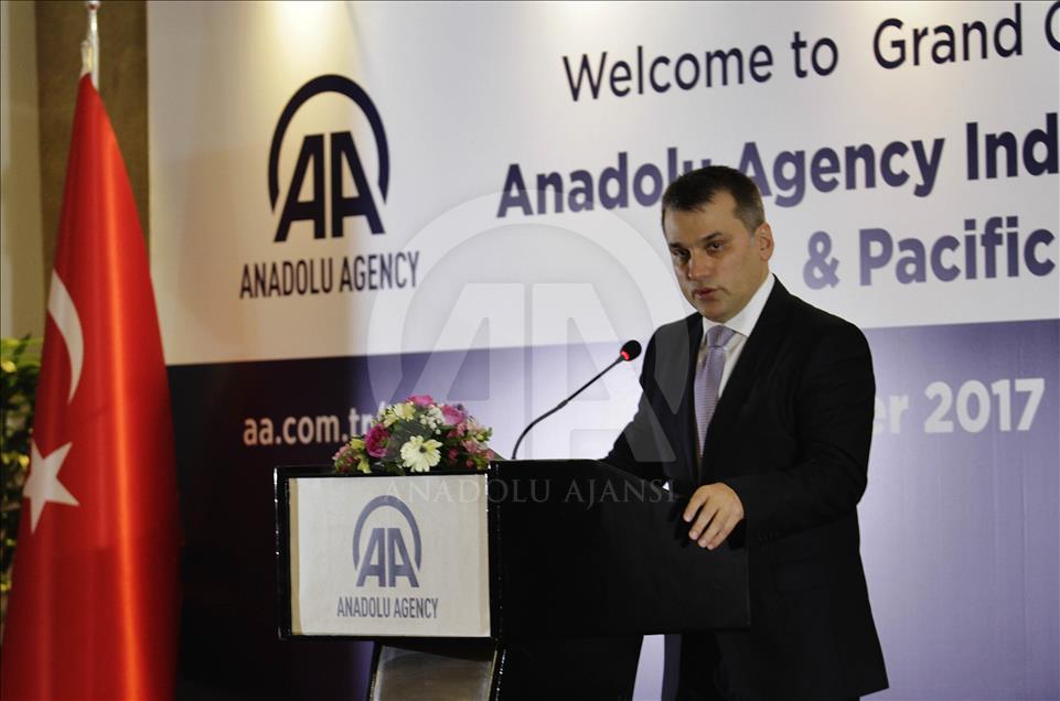 Kepala Biro Indonesia Dandy Koswaraputra memberikan sambutan saat peresmian layanan Bahasa Indonesia di Hotel Borbudur, Jakarta, Selasa 23 Oktober 2017. Peresmian dilakukan langsung oleh Deputi Direktur Jenderal Anadolu Agency Mustafa Ozkaya, Board Member Ali Turker Pirtini, Duta Besar Turki untuk Indonesia Sander Gurbuz dan dihadiri petinggi-petinggi dari media massa nasional Indonesia. (Anadolu Agency-Eko Siswono Toyudho) Eko Siswono Toyudho