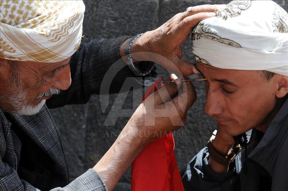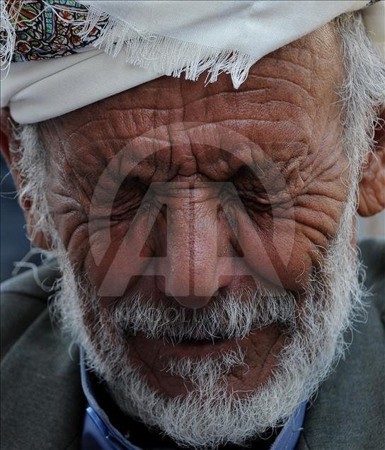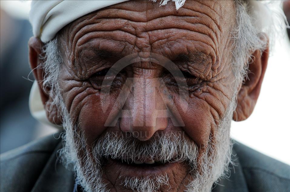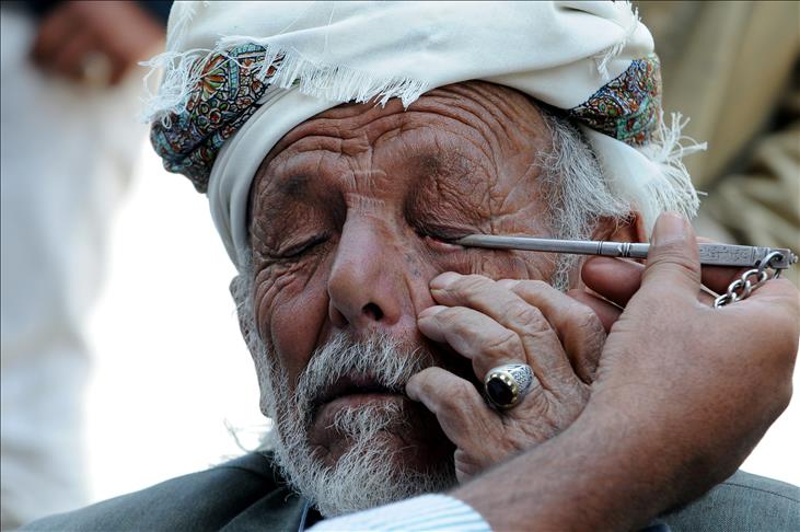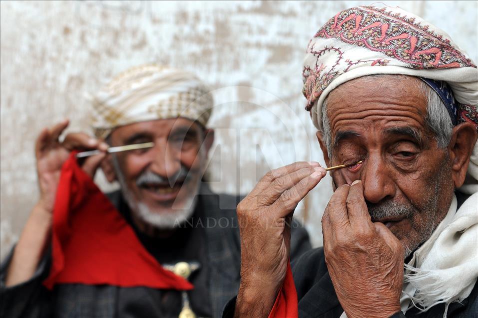 Seorang pria tua sedang dioleskan sipat mata setelah berdoa di Masjid Agung Sana'a pada 23 Mei 2018 di Sana'a, Yaman. Menggunakan sipat mata adalah tradisi pria muslim di Yaman pada bulan suci Ramadan.
