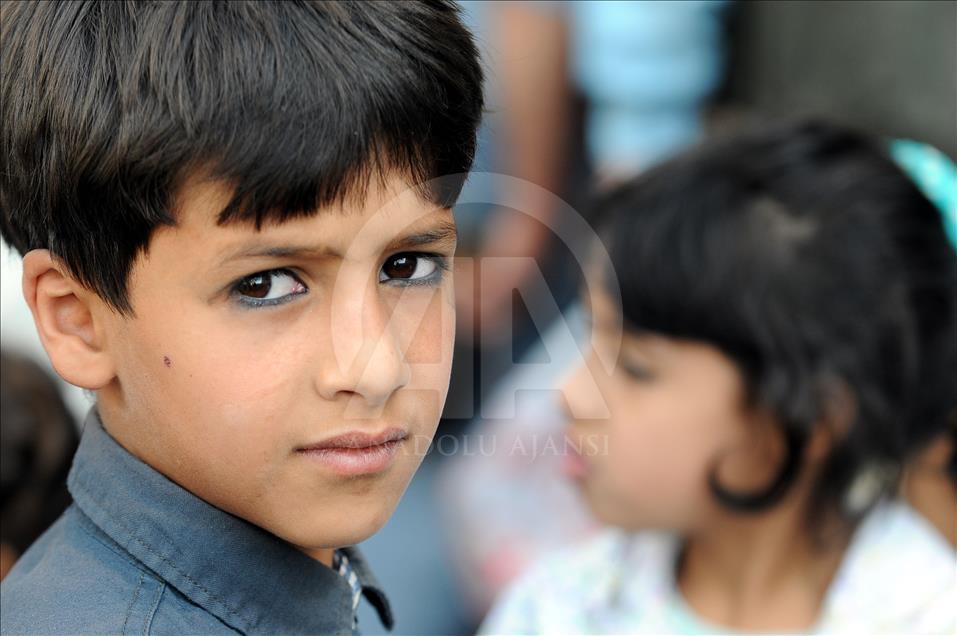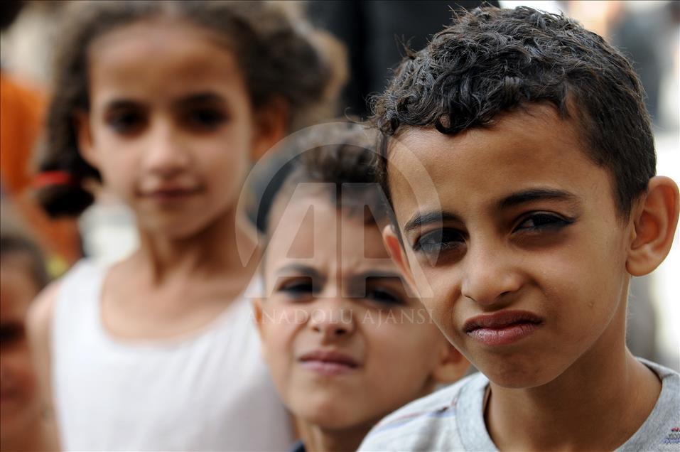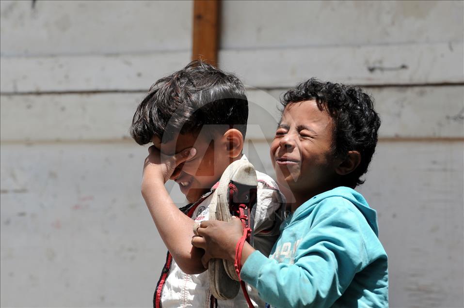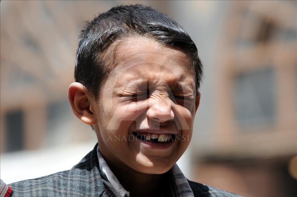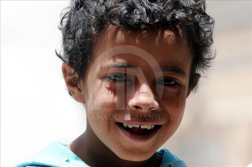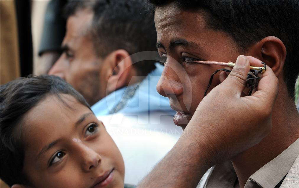 Anak-anak memejamkan mata mereka setelah menggunakan sipat mata di Masjid Agung Sana'a pada 23 Mei 2018 di Sana'a, Yaman. Mengenakan sipat mata adalah tradisi di antara pria Muslim selama bulan suci Ramadan.