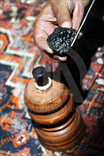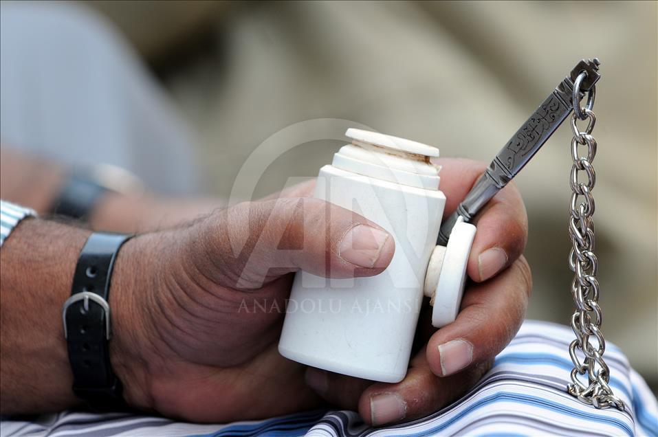 Seseorang memegang sipat mata tradisional di Masjid Agung Sana'a pada 23 Mei 2018 di Sana'a, Yaman. Mengenakan eyeliners adalah tradisi di antara pria Muslim selama bulan suci Ramadan. Mohammed Hamoud
