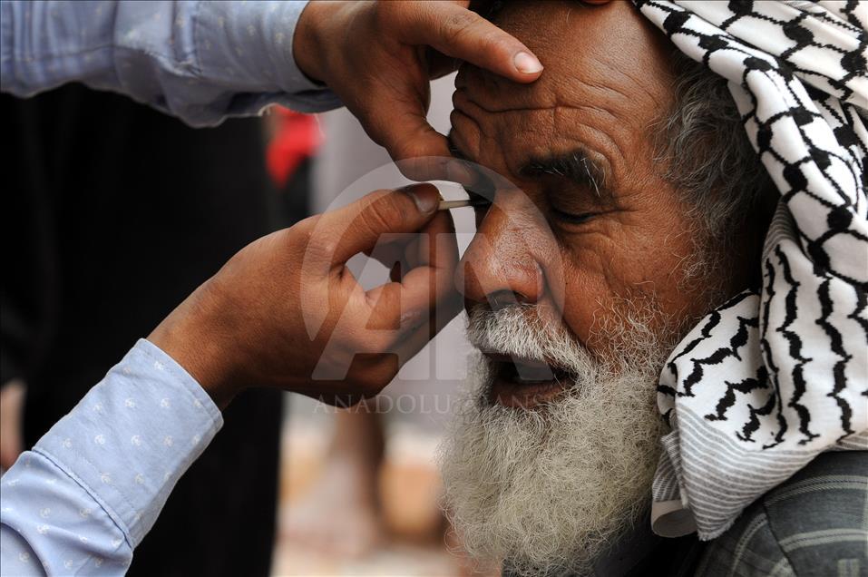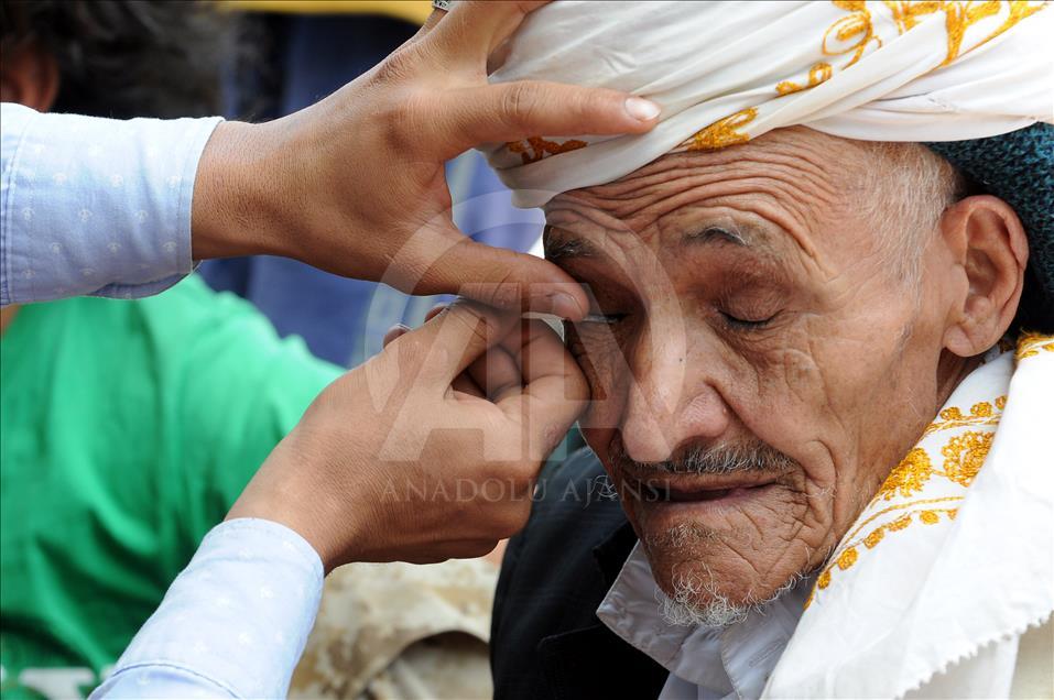 Seorang pria tua sedang dioleskan sipat mata setelah berdoa di Masjid Agung Sana'a pada 23 Mei 2018 di Sana'a, Yaman. Mengenakan sipat mata adalah tradisi di antara pria Muslim selama bulan suci Ramadhan.Mohammed Hamoud