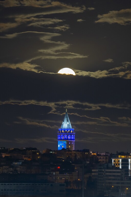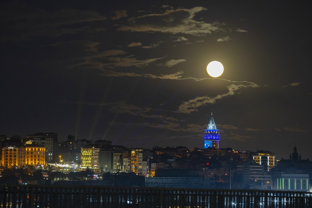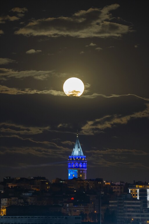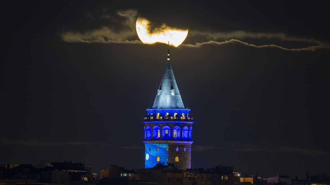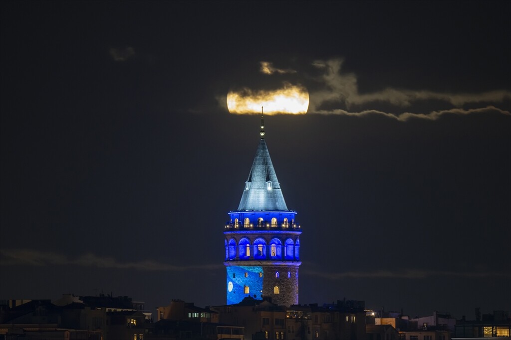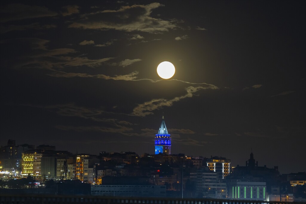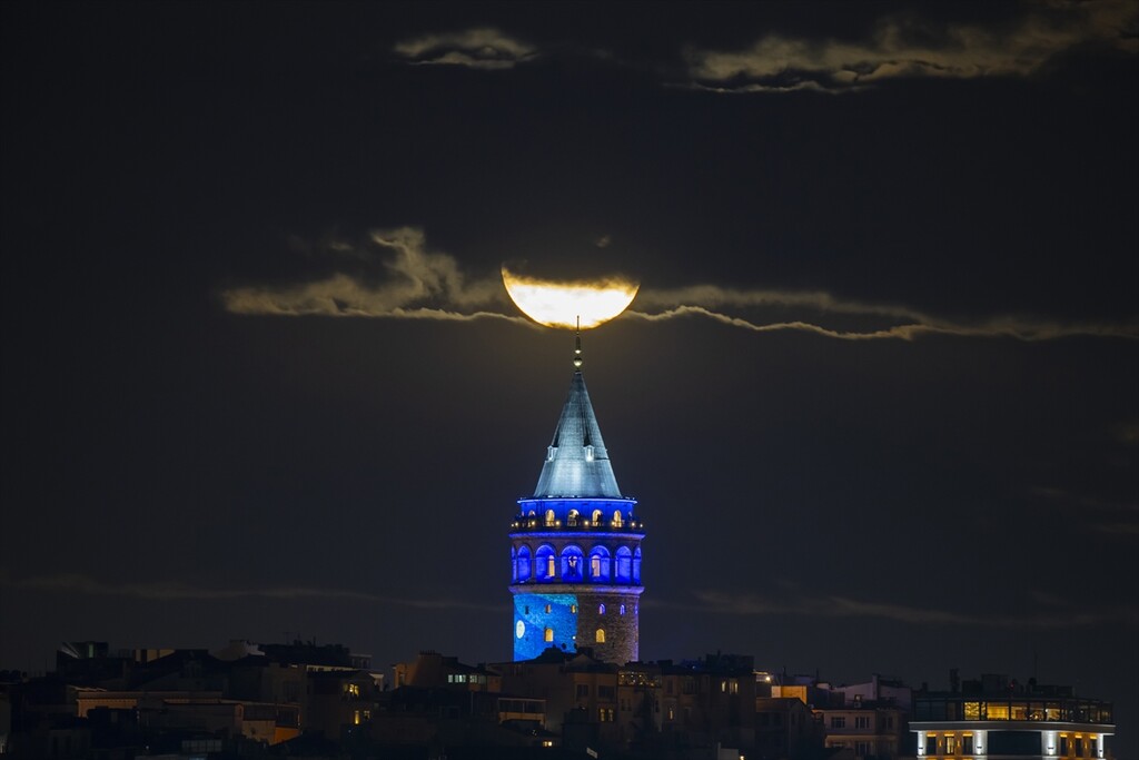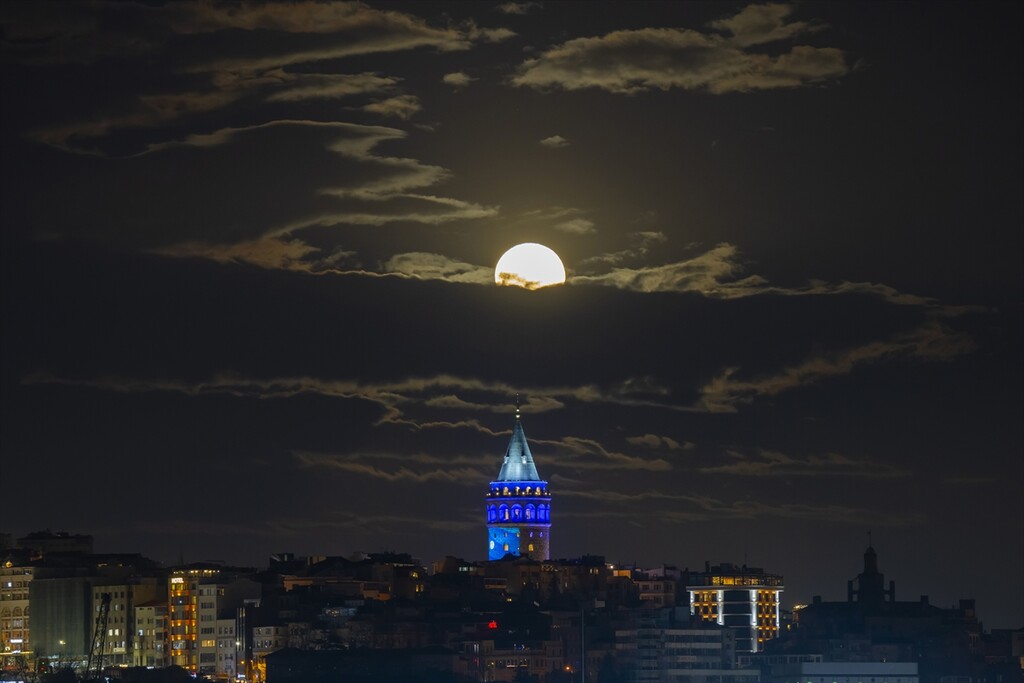 Istanbul, Türkiye – 2 April 2026: Bulan purnama terlihat di atas Menara Galata yang bersejarah di Istanbul, Türkiye.