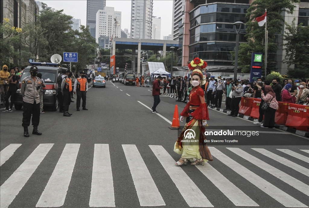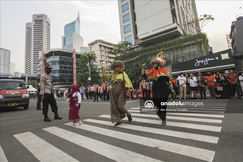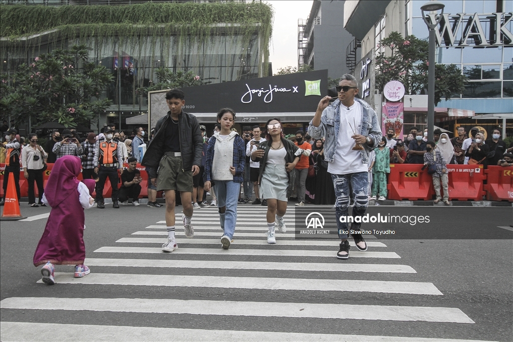 Orang-orang berjalan di atas zebra cross layaknya model catwalk di kawasan Dukuh Atas Jakarta, Indonesia pada 28 Juli 2022. Kawasan Dukuh Atas di Jakarta belakangan ini viral setelah warga dan kalangan pecinta fashion berkumpul di sini serta memamerkan gayanya layaknya model sungguhan atau dikenal sebagai Citayam Fashion Week.Eko Siswono Toyudho