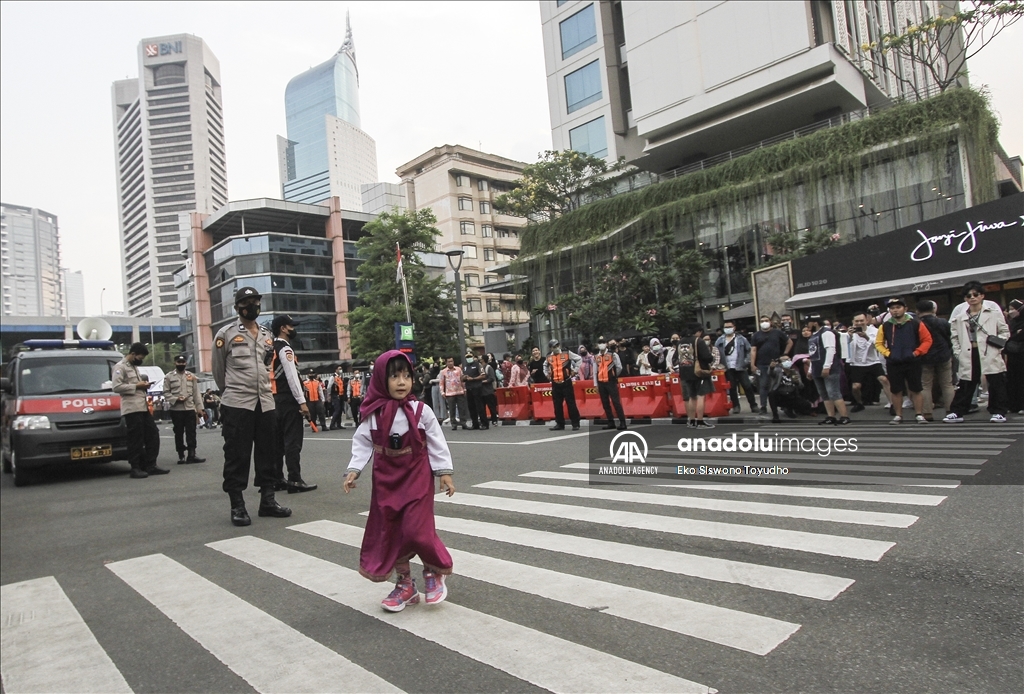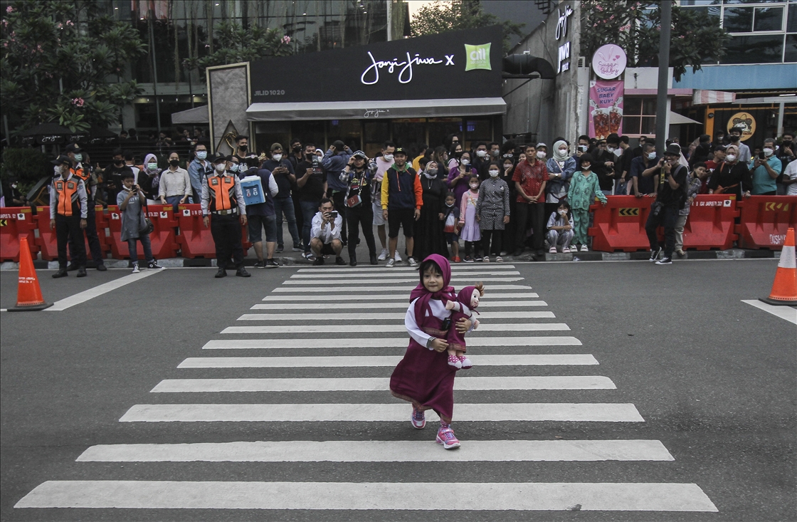 Seorang anak berjalan di atas zebra cross layaknya model catwalk di kawasan Dukuh Atas Jakarta, Indonesia pada 28 Juli 2022. Kawasan Dukuh Atas di Jakarta belakangan ini viral setelah warga dan kalangan pecinta fashion berkumpul di sini serta memamerkan gayanya layaknya model sungguhan atau dikenal sebagai Citayam Fashion Week.Eko Siswono Toyudho