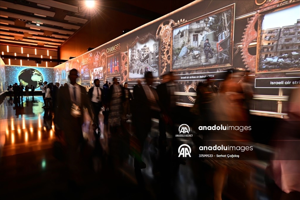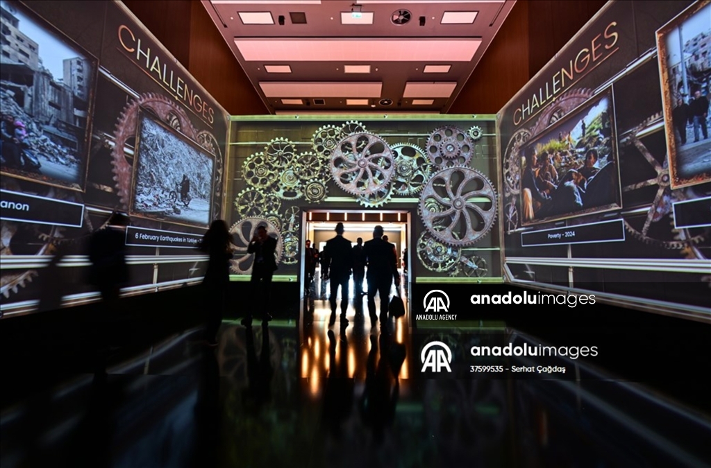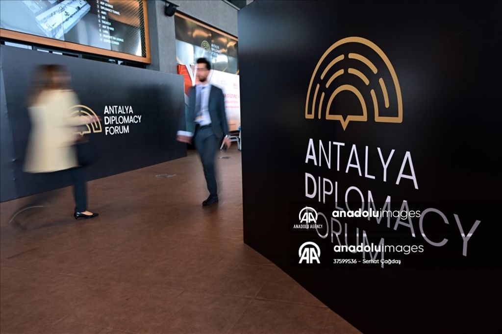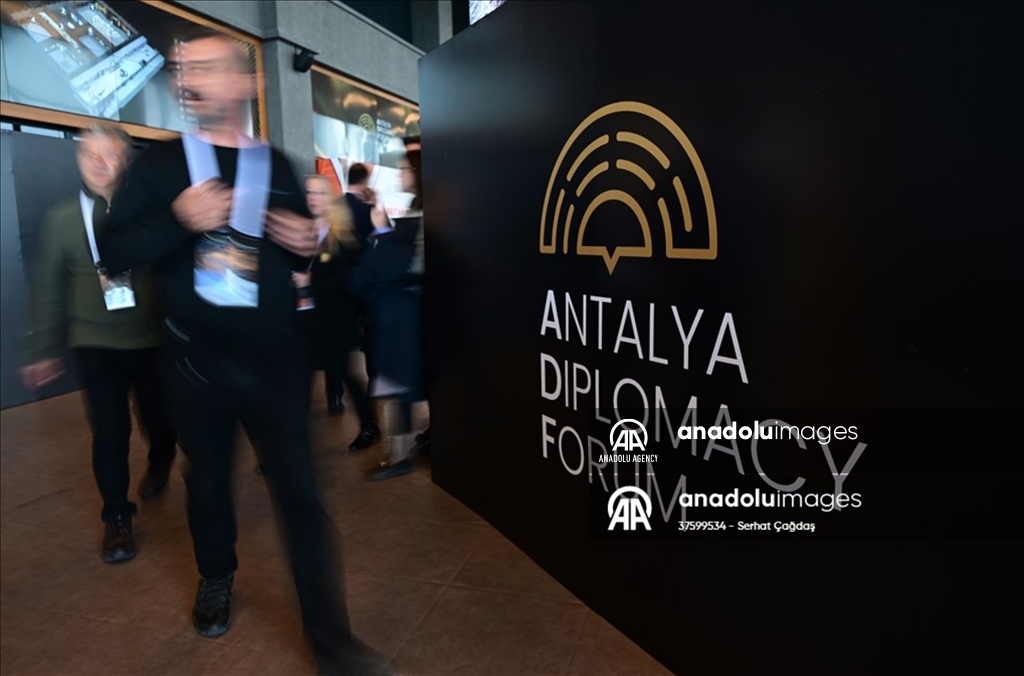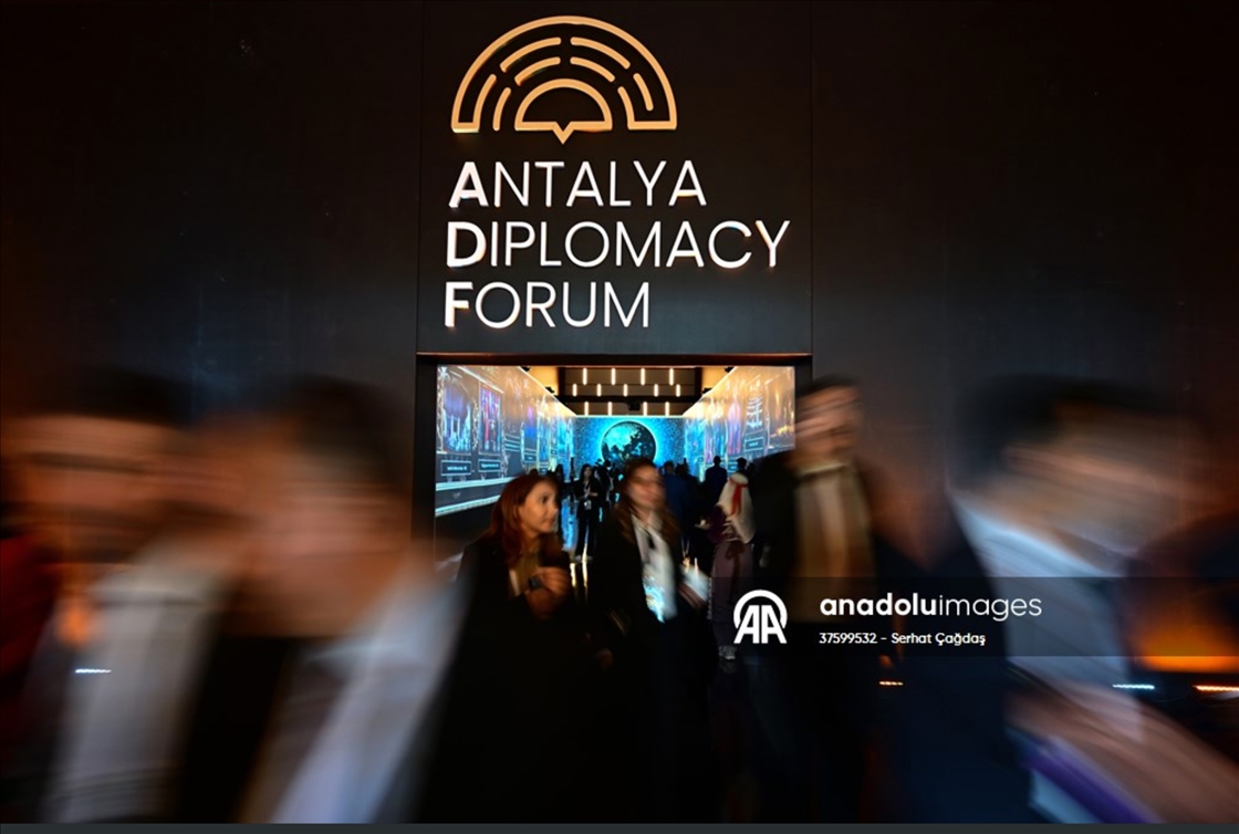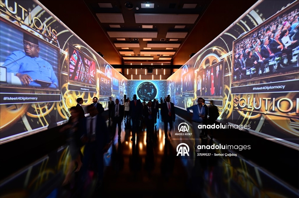 Orang-orang melintasi “Terowongan Diplomasi” tempat presentasi visual dipamerkan saat Forum Diplomasi Antalya ke-4 (ADF2025), di mana Anadolu Agency (AA) menjadi Mitra Komunikasi Global, di Pusat Kongres NEST di kawasan pariwisata Belek, Antalya, Turki, pada tanggal 11 April 2025.Serhat Çağdaş