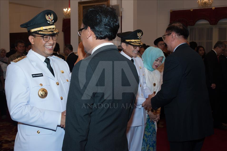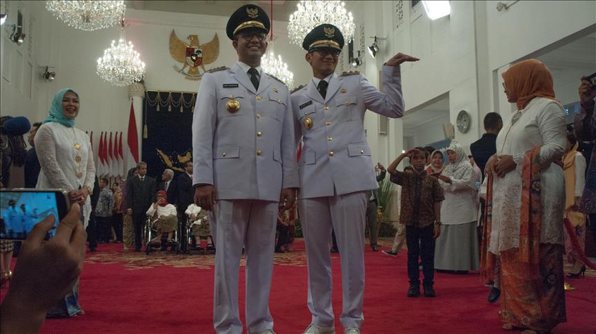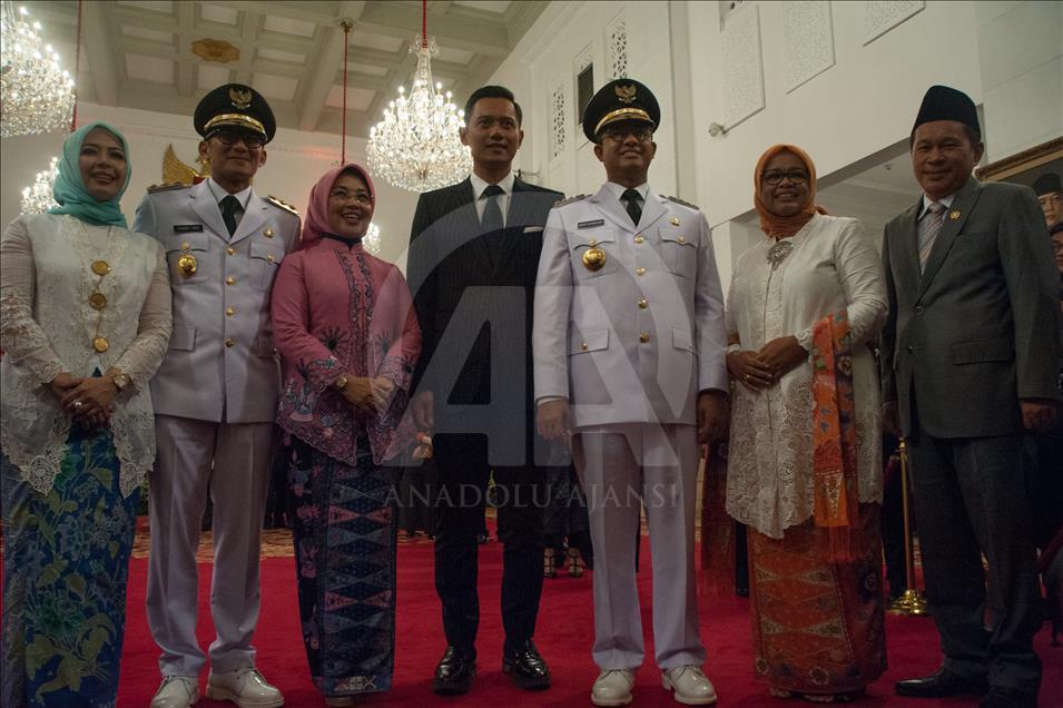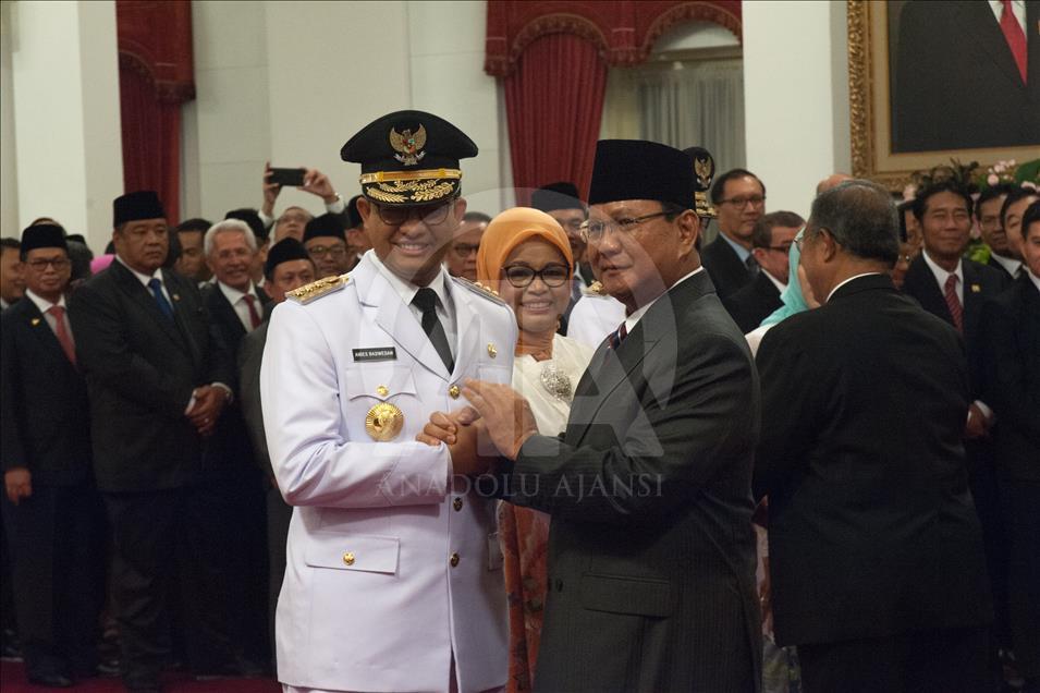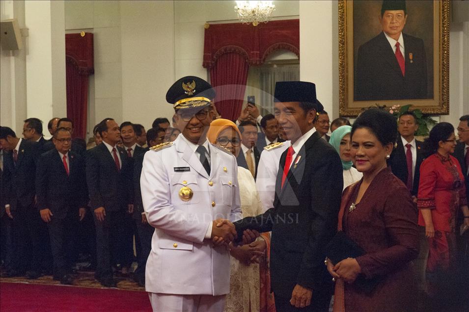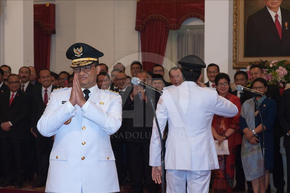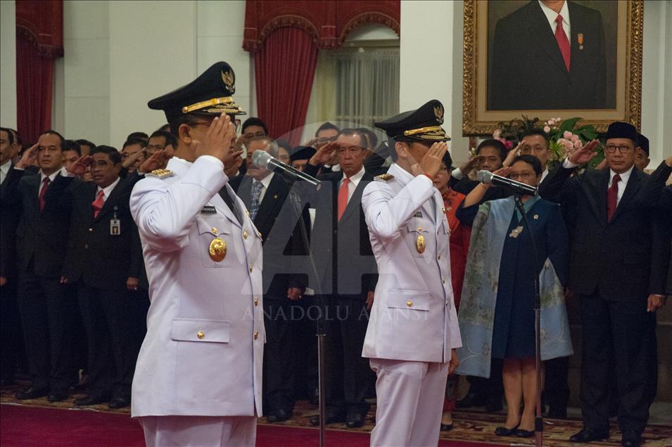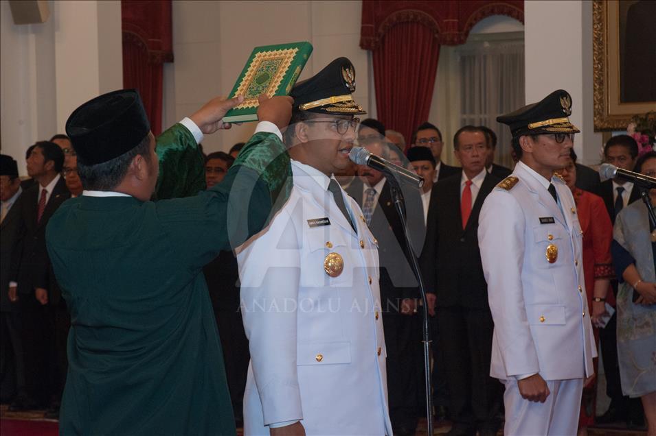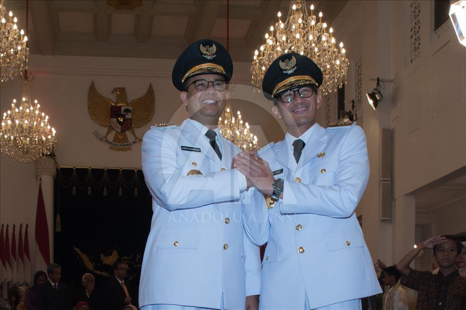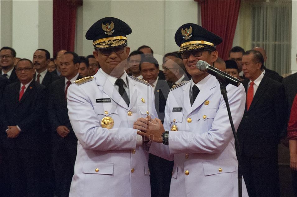Anies Baswedan dan Sandiaga Uno dilantik menjadi pemimpin Jakarta oleh Presiden Joko Widodo di Istana Negara, Jakarta, 16 Oktober 2017.