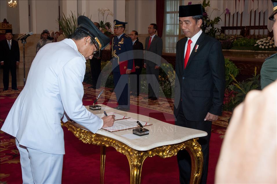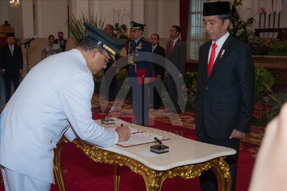 Anies Baswedan (kiri) menandatangani berita acara pelantikan sebagai Gubernur DKI Jakarta yang juga ditandatangani oleh Presiden Joko Widodo (kanan) di Istana Negara, 16 Oktober 2017.Anton Raharjo