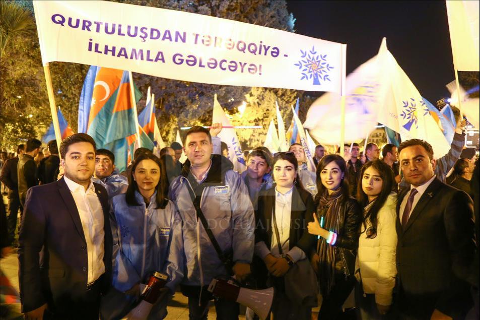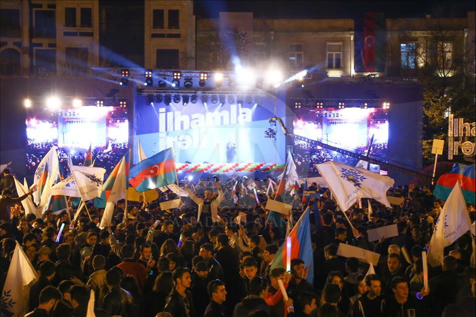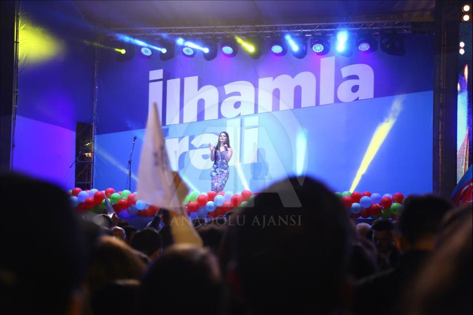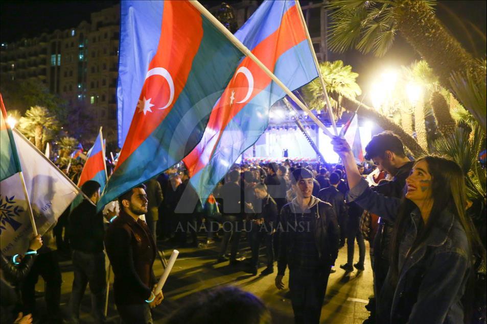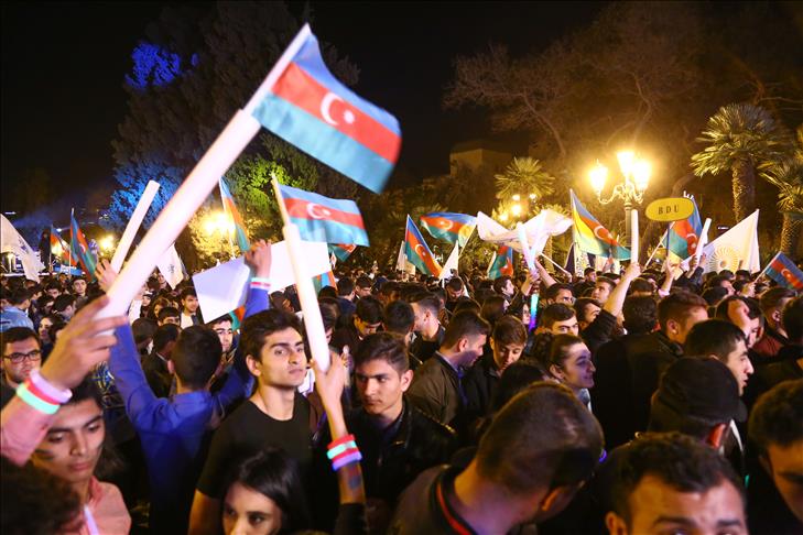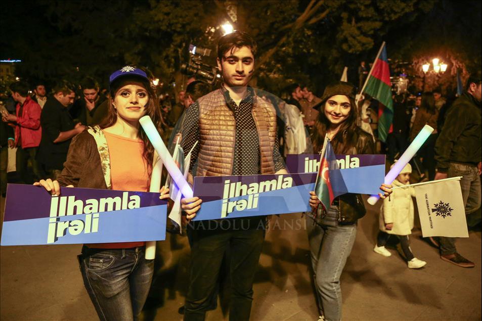 Masyarakat Azerbaijan berkumpul untuk merayakan hasil pemilu Presiden, setelah Ilham Aliyev terpilih kembali menjadi Presiden Azebaijan, pada 11 April 2018 di depan markas Partai Baru Azerbaijan (YAP) di Baku, Azerbaijan pada 11 April 2018.