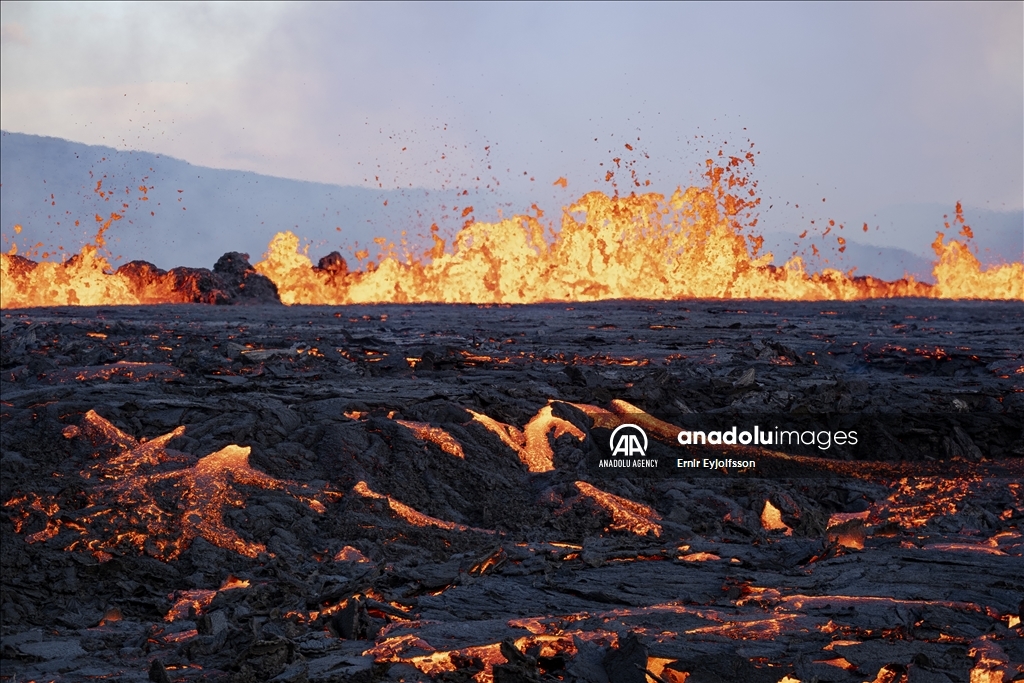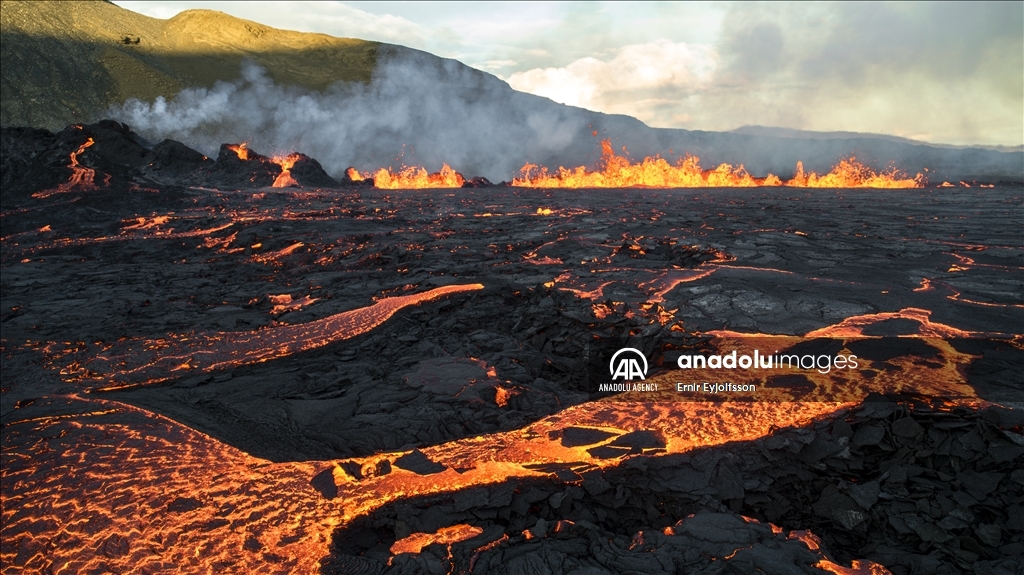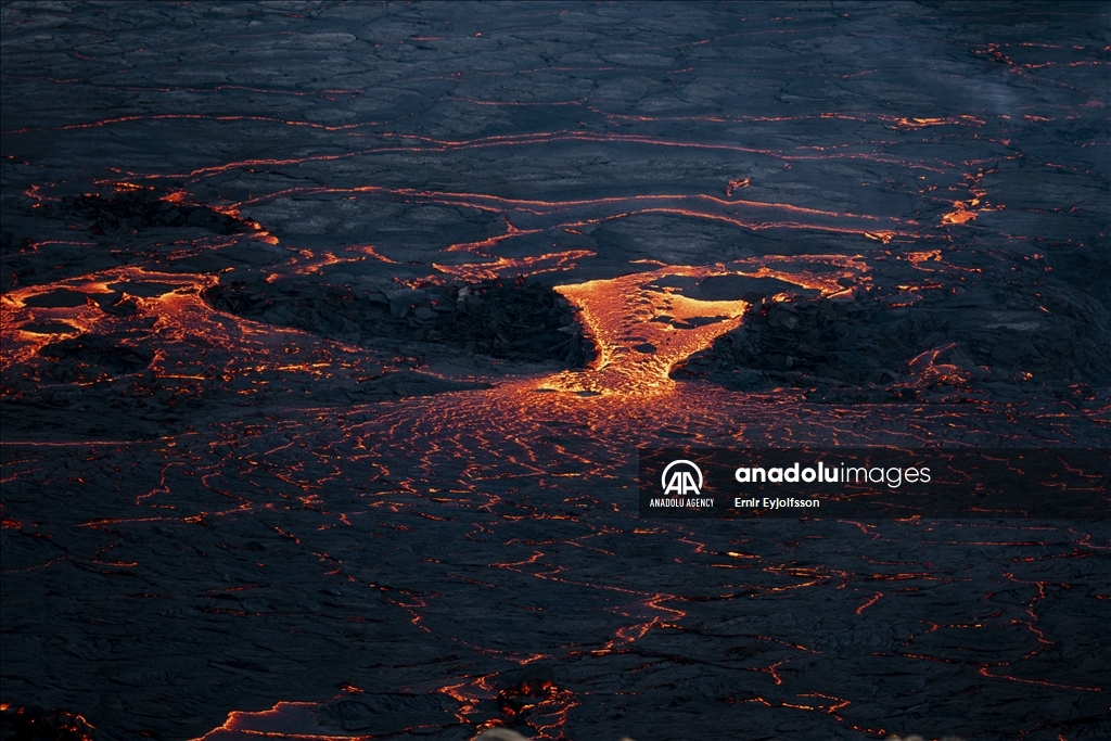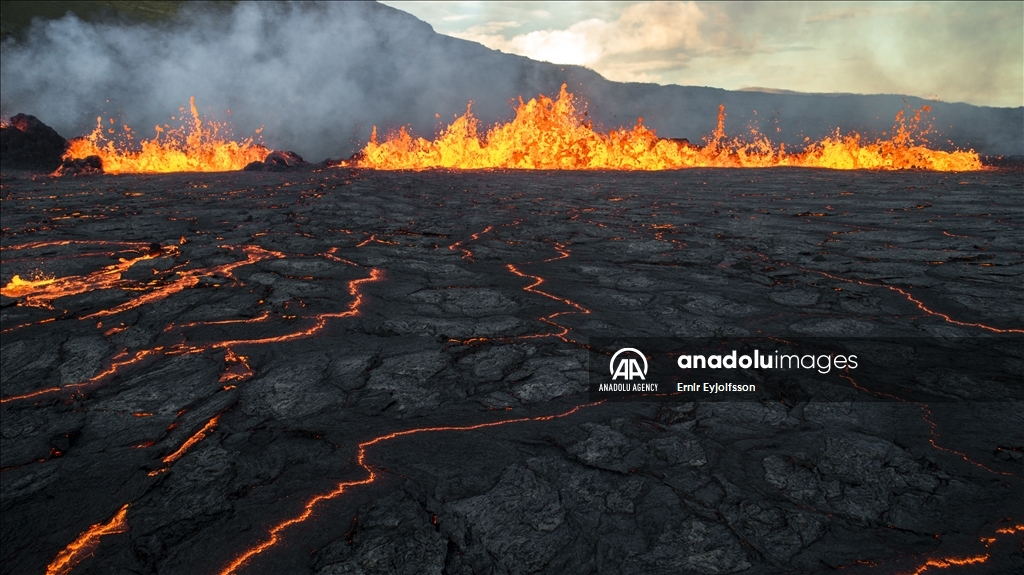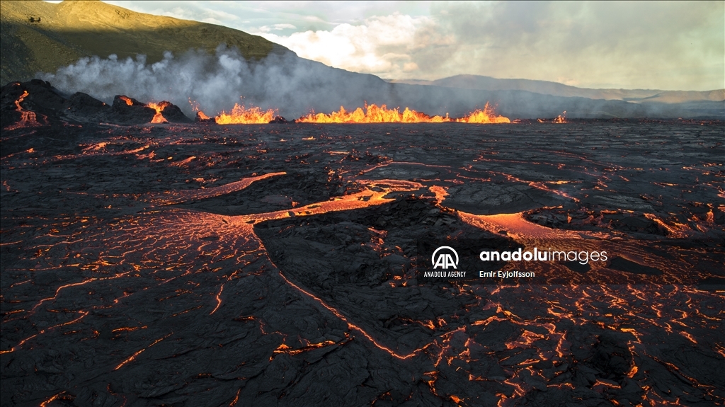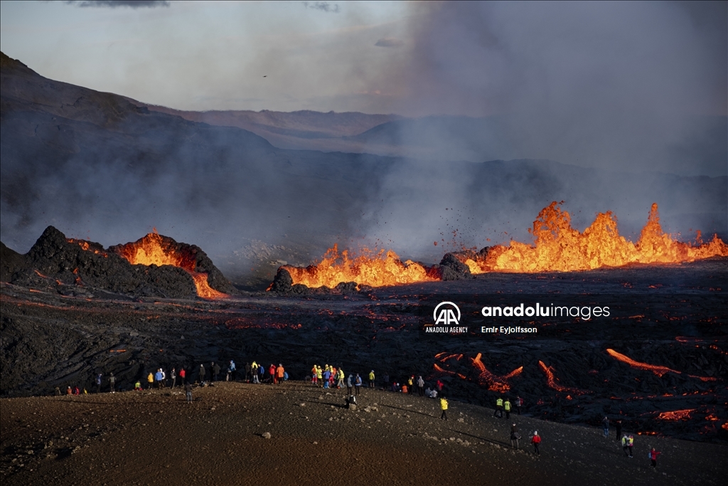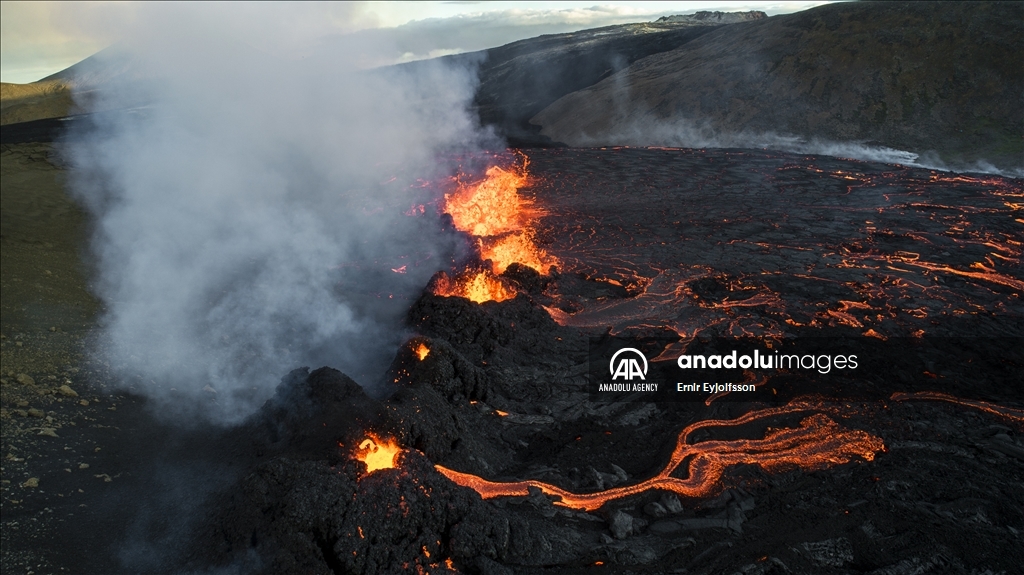 MERADALIR, ICELAND - AUGUST 3: A general view of a volcano as lava flows through a new fissure following a volcanic eruption in the Meradalir valley on the Reykjanes peninsula in Iceland on August 03, 2022. The crack is approximately one km away from a crater which stopped erupting in December 2021. The eruption is not currently affecting any life or infrastructure in Iceland. Many local and foreign tourists walk for one and a half hours to see the explosion up close. ( Ernir Eyjolfsson - Anadolu Agency )Ernir Eyjolfsson