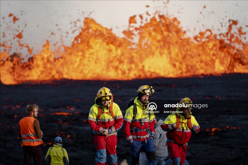 Petugas berjaga di lokasi saat wisatawan berkunjung untuk melihat lava yang mengalir melalui celah baru setelah letusan gunung berapi di lembah Meradalir di semenanjung Reykjanes di Islandia pada 03 Agustus 2022. Retakan tersebut berjarak sekitar 1 km dari kawah yang berhenti meletus pada Desember 2021. Letusan saat ini tidak membahayakan dan tidak merusak infrastruktur di Islandia.