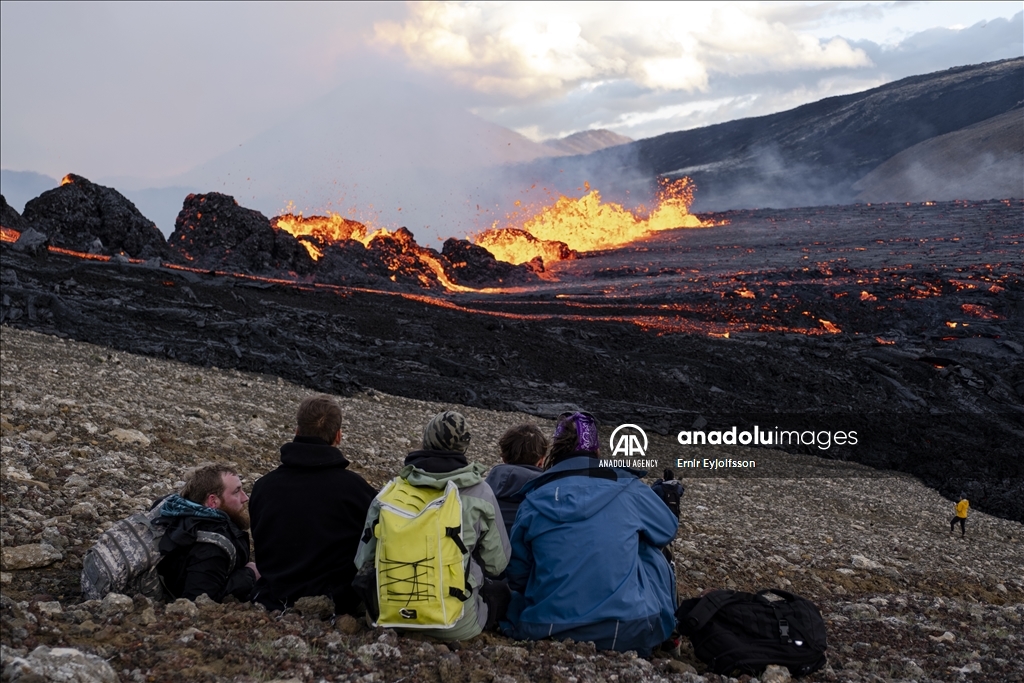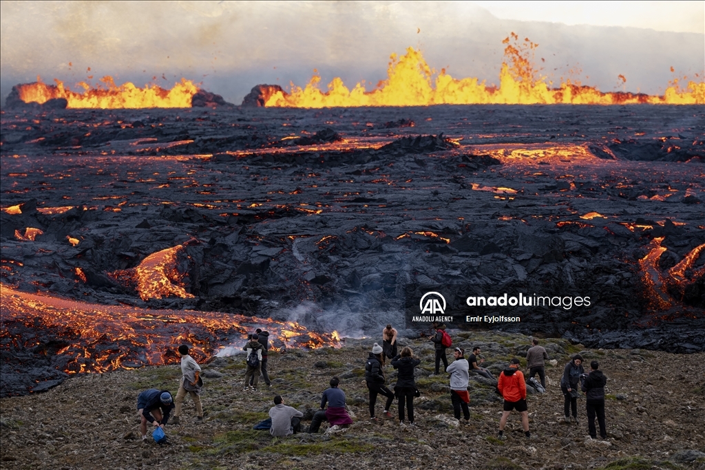 Wisatawan berkunjung untuk melihat lava yang mengalir melalui celah baru setelah letusan gunung berapi di lembah Meradalir di semenanjung Reykjanes di Islandia pada 03 Agustus 2022. Retakan tersebut berjarak sekitar 1 km dari kawah yang berhenti meletus pada Desember 2021. Letusan saat ini tidak membahayakan dan tidak merusak infrastruktur di Islandia.