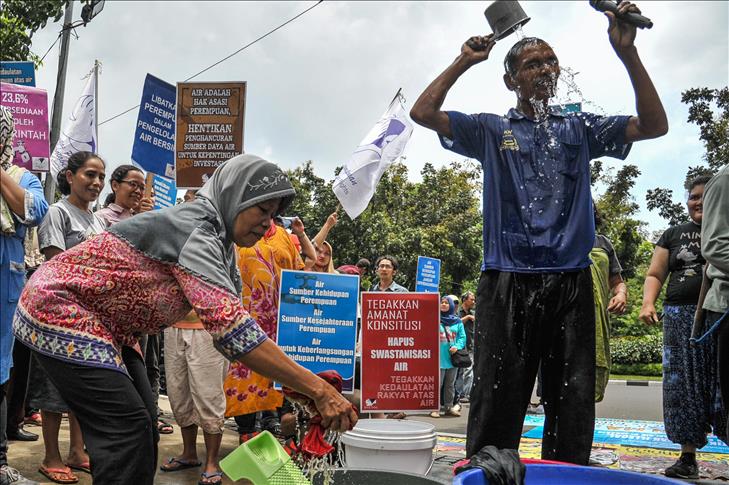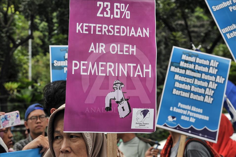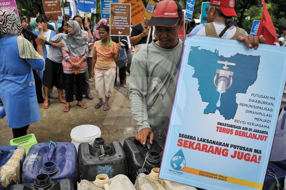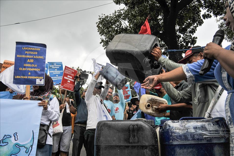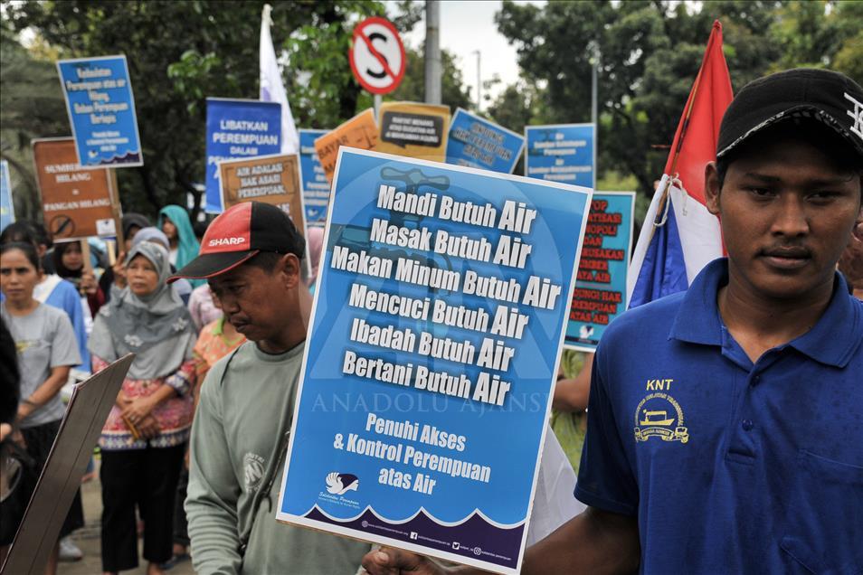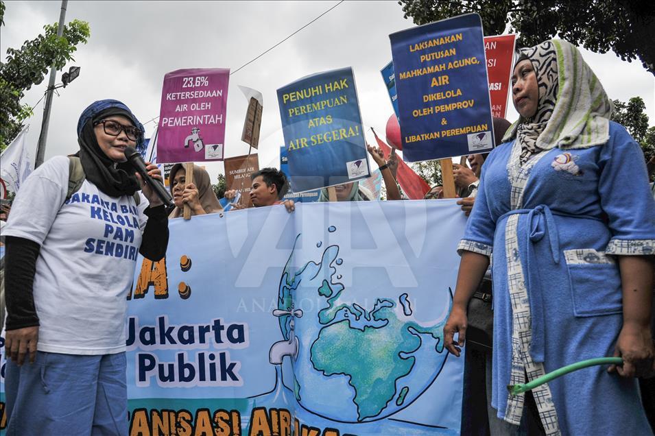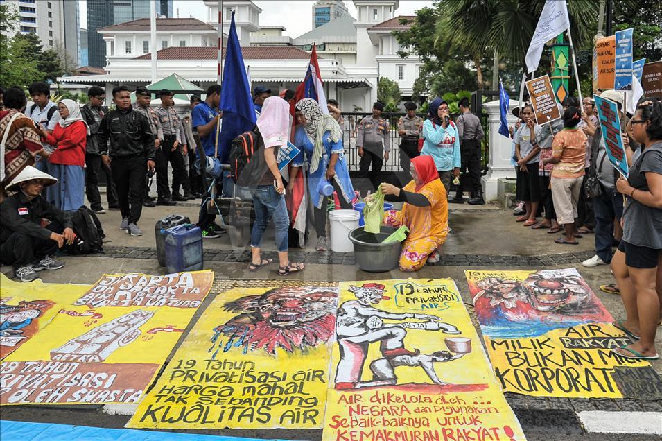 Pengunjuk rasa menunjukkan poster stop privatisasi air Jakarta di depan Balai Kota di Jakarta, aksi yang dilakukan bertepatan dengan hari air sedunia ini mendesak pemerintah DKI Jakarta untuk menghentikan privatisasi air bersih oleh swasta.