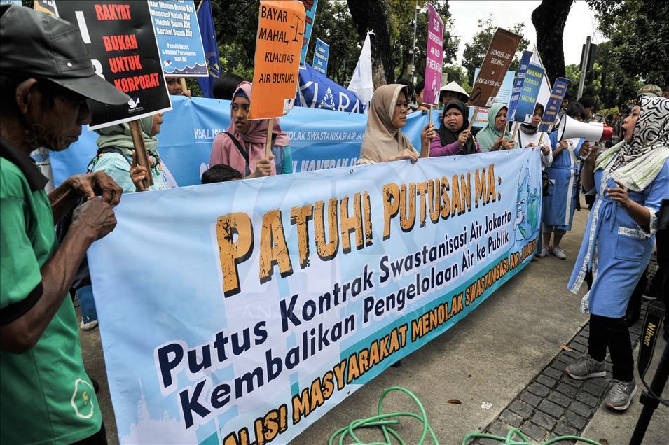 Pengunjuk rasa menunjukkan poster stop privatisasi air Jakarta di depan Balai Kota di Jakarta, aksi yang dilakukan bertepatan dengan hari air sedunia ini mendesak pemerintah DKI Jakarta untuk menghentikan privatisasi air bersih oleh swasta. Anton Raharjo