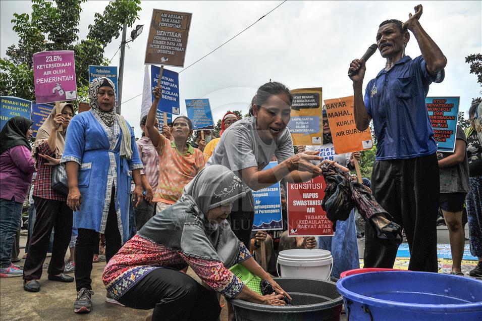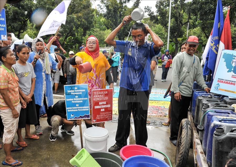 Pengunjuk rasa melakukan aksi mandi dan mencuci di depan Balai Kota di Jakarta, aksi yang dilakukan bertepatan dengan hari air sedunia ini mendesak pemerintah DKI Jakarta untuk menghentikan privatisasi air bersih oleh swasta.
