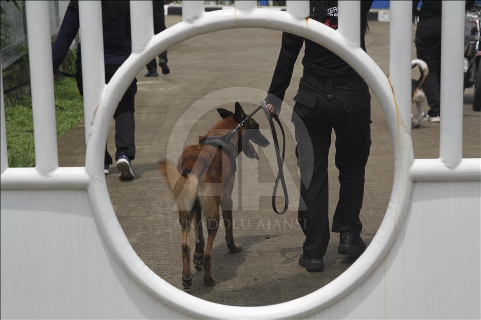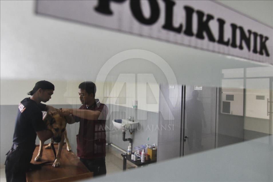 Seorang dokter hewan memeriksa kesehatan anjing sebelum melakukan pelatihan deteksi narkotik di Indoor Training Pusat Pelatihan K-9 Badan Narkotika Nasional, Bogor, Jawa Barat pada Kamis 8 November 2018. Eko Siswono Toyudho