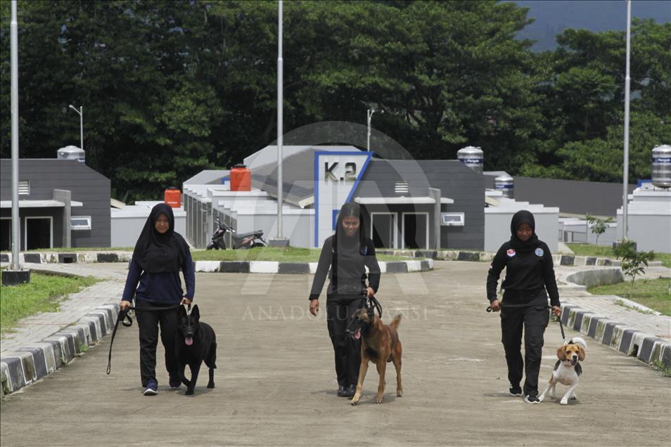 Tiga wanita petugas Unit Deteksi K-9 BNN membawa anjing di Pusat Pelatihan K-9 Badan Narkotika Nasional, Bogor, Jawa Barat pada Kamis 8 November 2018.Eko Siswono Toyudho