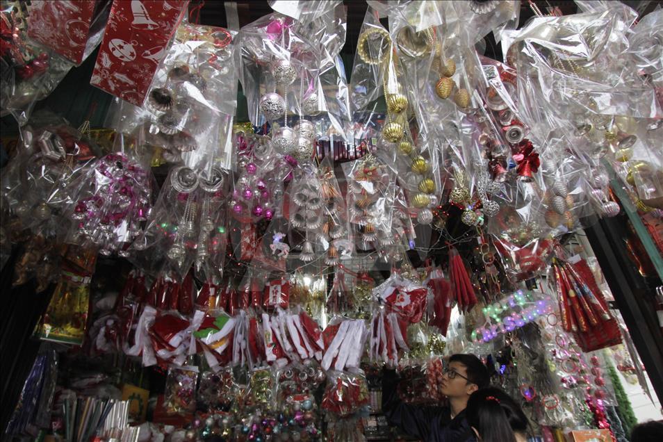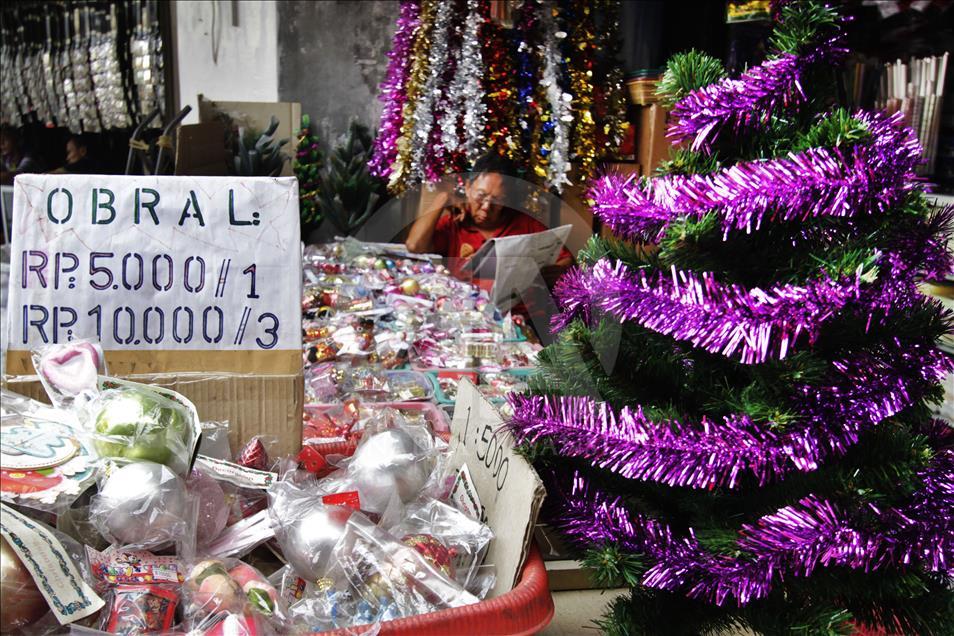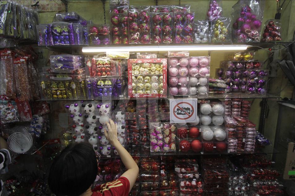Seorang penjual menunggu calon pembeli memilih hiasan Natal di Pasar Asemka, Jakarta, Indonesia pada 18 Desember 2017. Berbagai pernak-pernik Natal untuk hiasan pohon dan rumah dijual berkisar dari harga Rp 5 ribu hingga Rp 2 juta, kebanyakan berasal dari Tiongkok. Eko Siswono Toyudho